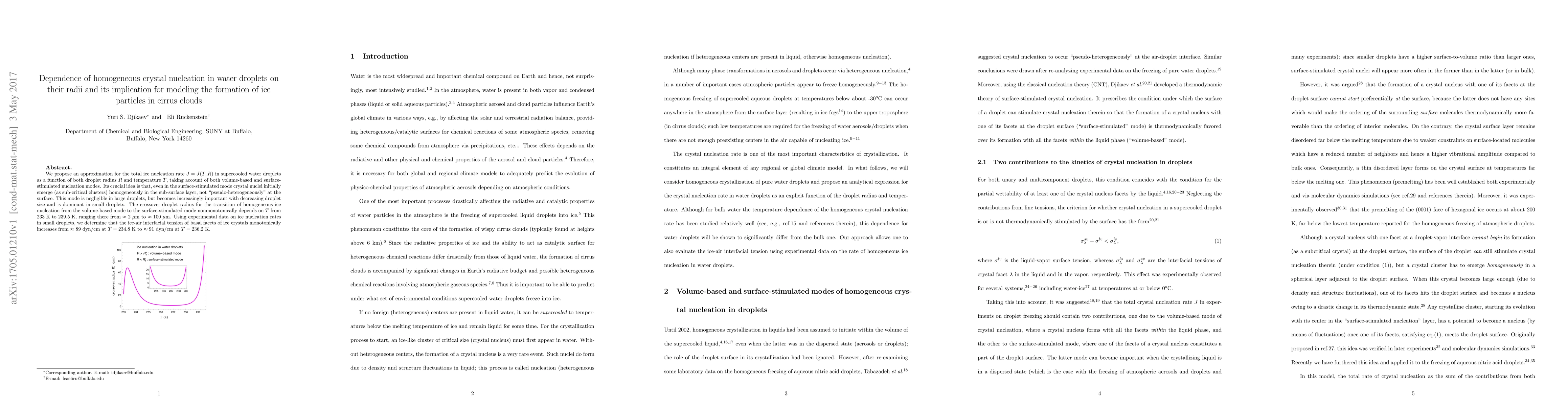 We propose an approximation for the total ice nucleation rate J=J(T,R) in supercooled water droplets as a function of both droplet radius R and temperature T, taking account of both volume-based and surface-stimulated nucleation modes. Its crucial idea is that, even in the surface-stimulated mode crystal nuclei initially emerge (as sub-critical clusters) homogeneously in the sub-surface layer, not "pseudo-heterogeneously" at the surface. This mode is negligible in large droplets, but becomes increasingly important with decreasing droplet size and is dominant in small droplets. The crossover droplet radius for the transition of homogeneous ice nucleation from the volume-based mode to the surface-stimulated mode nonmonotonically depends on T from 233 K to 239.5 K, ranging there from about 2 microns to about 100 microns. Using experimental data on ice nucleation rates in small droplets, we determine that the ice-air interfacial tension of basal facets of ice crystals monotonically increases from about 89 dyn/cm at T=234.8 K to about 91 dyn/cm at T=236.2 K.