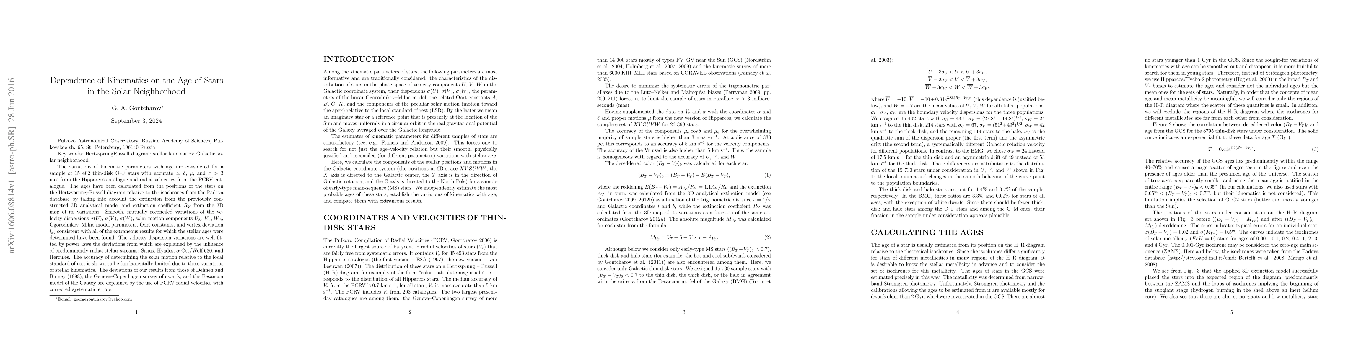 The variations of kinematic parameters with age are considered for a sample of 15 402 thin-disk O--F stars with accurate $\alpha$, $\delta$, $\mu$, and $\pi>3$ mas from the Hipparcos catalogue and radial velocities from the PCRV catalogue. The ages have been calculated from the positions of the stars on the Hertzsprung--Russell diagram relative to the isochrones from the Padova database by taking into account the extinction from the previously constructed 3D analytical model and extinction coefficient $R_V$ from the 3D map of its variations. Smooth, mutually reconciled variations of the velocity dispersions $\sigma(U)$, $\sigma(V)$, $\sigma(W)$, solar motion components $U_{\odot}$, $V_{\odot}$, $W_{\odot}$, Ogorodnikov--Milne model parameters, Oort constants, and vertex deviation $lxy$ consistent with all of the extraneous results for which the stellar ages were determined have been found. The velocity dispersion variations are well fitted by power laws the deviations from which are explained by the influence of predominantly radial stellar streams: Sirius, Hyades, $\alpha$~Cet/Wolf~630, and Hercules. The accuracy of determining the solar motion relative to the local standard of rest is shown to be fundamentally limited due to these variations of stellar kinematics. The deviations of our results from those of Dehnen and Binney (1998), the Geneva--Copenhagen survey of dwarfs, and the Besancon model of the Galaxy are explained by the use of PCRV radial velocities with corrected systematic errors.