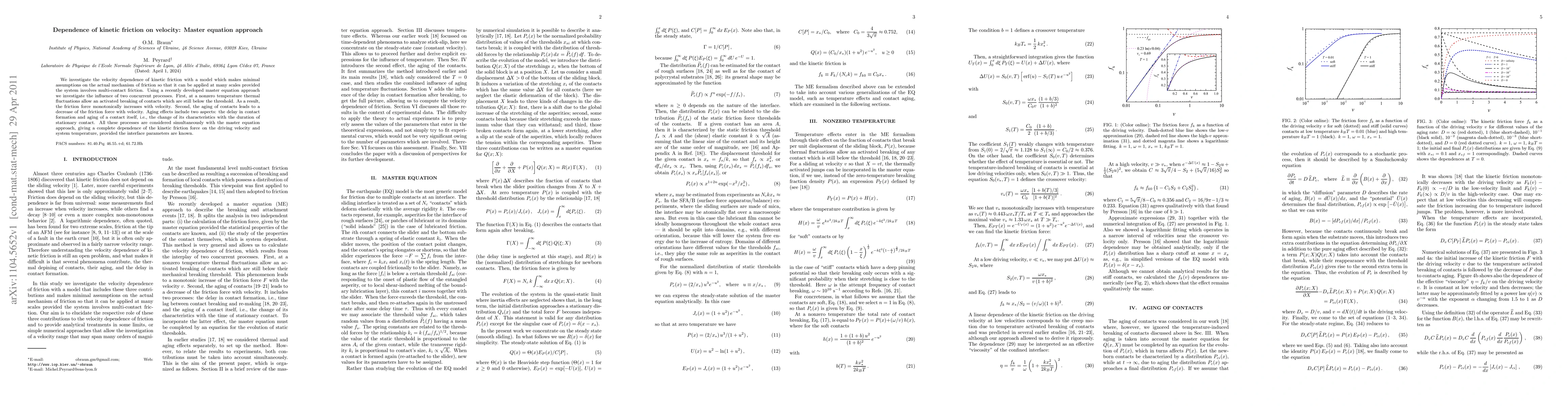 This paper explores the velocity dependence of kinetic friction using a master equation approach, revealing two main processes: thermal fluctuations causing an increase in friction with velocity, and contact aging leading to a decrease in friction. The model provides a comprehensive relationship between friction force, velocity, and temperature.