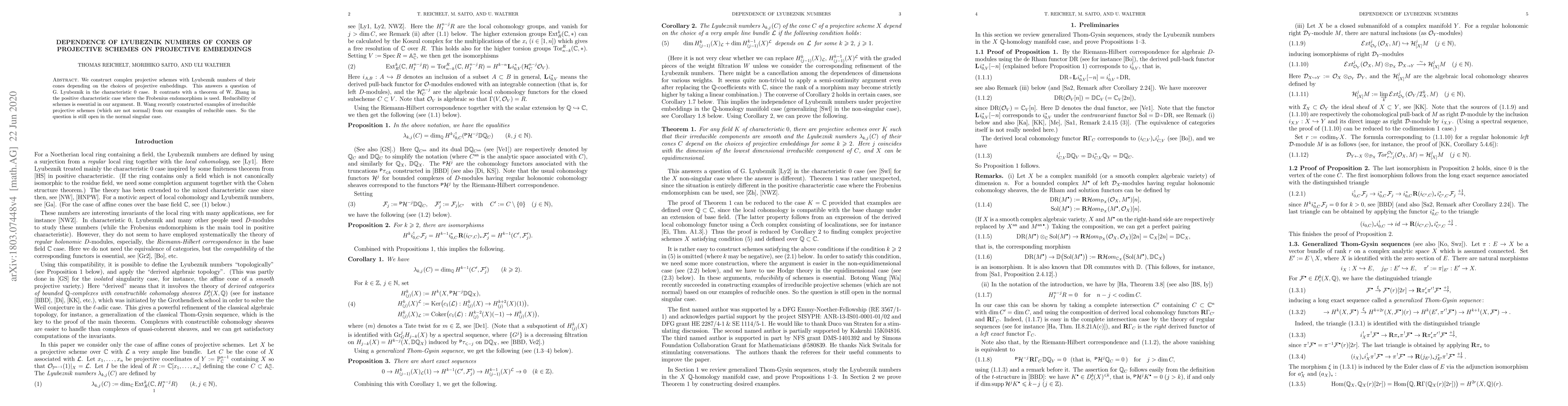 We construct complex projective schemes with Lyubeznik numbers of their cones depending on the choices of projective embeddings. This answers a question of G. Lyubeznik in the characteristic 0 case. It contrasts with a theorem of W. Zhang in the positive characteristic case where the Frobenius endomorphism is used. Reducibility of schemes is essential in our argument. B. Wang recently constructed examples of irreducible projective schemes (which are not normal) from our examples of reducible ones. So the question is still open in the normal singular case.