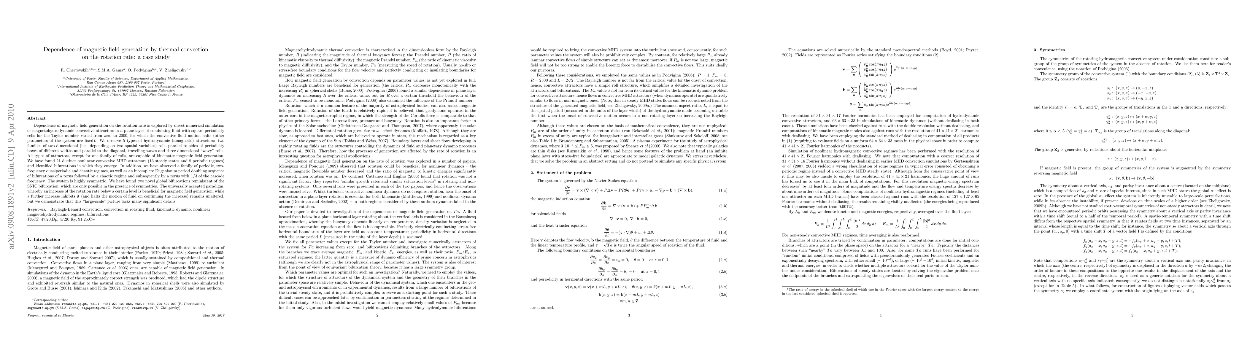 Dependence of magnetic field generation on the rotation rate is explored by direct numerical simulation of magnetohydrodynamic convective attractors in a plane layer of conducting fluid with square periodicity cells for the Taylor number varied from zero to 2000, for which the convective fluid motion halts (other parameters of the system are fixed). We observe 5 types of hydrodynamic (amagnetic) attractors: two families of two-dimensional (i.e. depending on two spatial variables) rolls parallel to sides of periodicity boxes of different widths and parallel to the diagonal, travelling waves and three-dimensional "wavy" rolls. All types of attractors, except for one family of rolls, are capable of kinematic magnetic field generation. We have found 21 distinct nonlinear convective MHD attractors (13 steady states and 8 periodic regimes) and identified bifurcations in which they emerge. In addition, we have observed a family of periodic, two-frequency quasiperiodic and chaotic regimes, as well as an incomplete Feigenbaum period doubling sequence of bifurcations of a torus followed by a chaotic regime and subsequently by a torus with 1/3 of the cascade frequency. The system is highly symmetric. We have found two novel global bifurcations reminiscent of the SNIC bifurcation, which are only possible in the presence of symmetries. The universally accepted paradigm, whereby an increase of the rotation rate below a certain level is beneficial for magnetic field generation, while a further increase inhibits it (and halts the motion of fluid on continuing the increase) remains unaltered, but we demonstrate that this "large-scale" picture lacks many significant details.