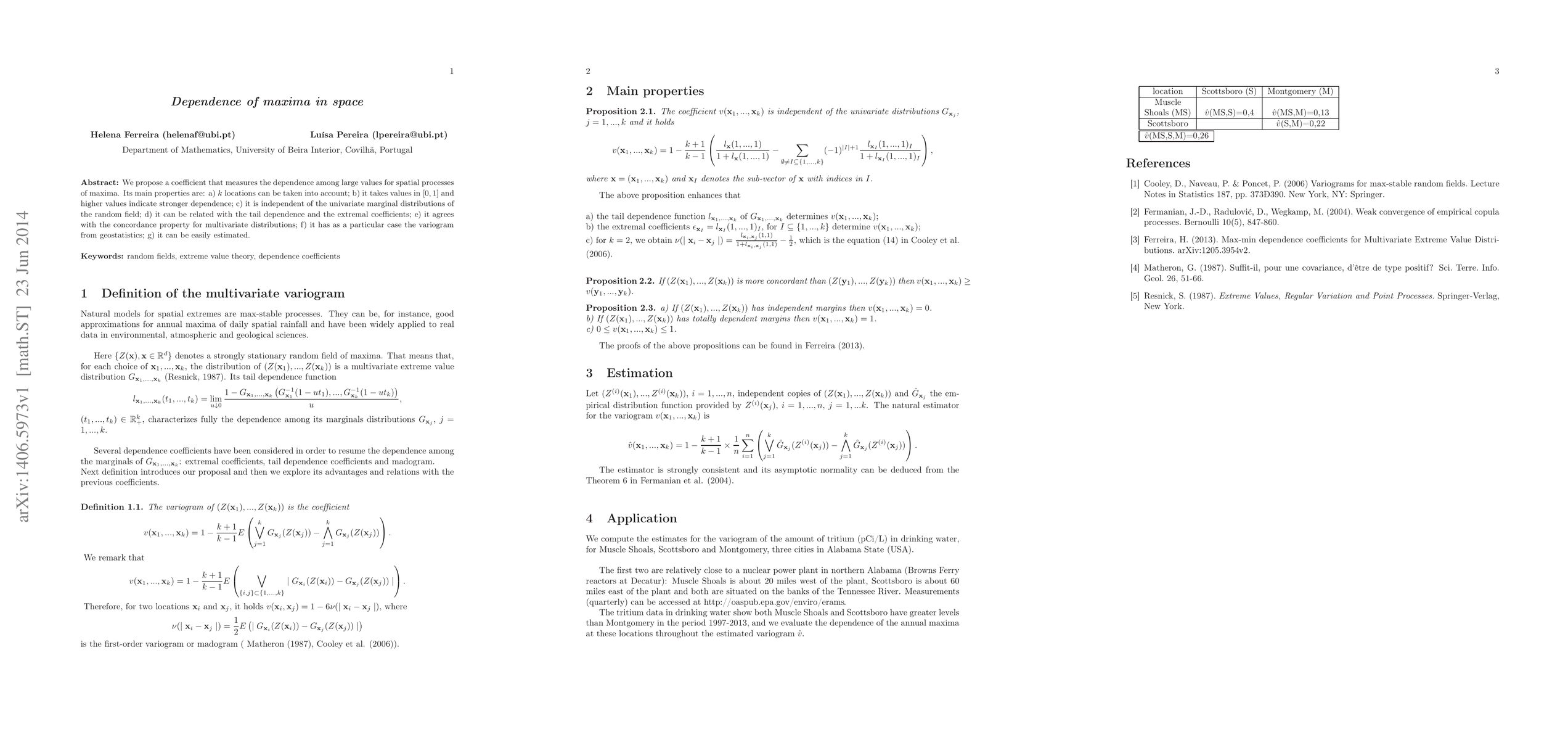 This paper introduces a coefficient to measure dependence among maxima in spatial processes, which accounts for $k$ locations, ranges from $0$ to $1$, and is independent of univariate marginal distributions. It relates to tail dependence and can be easily estimated.