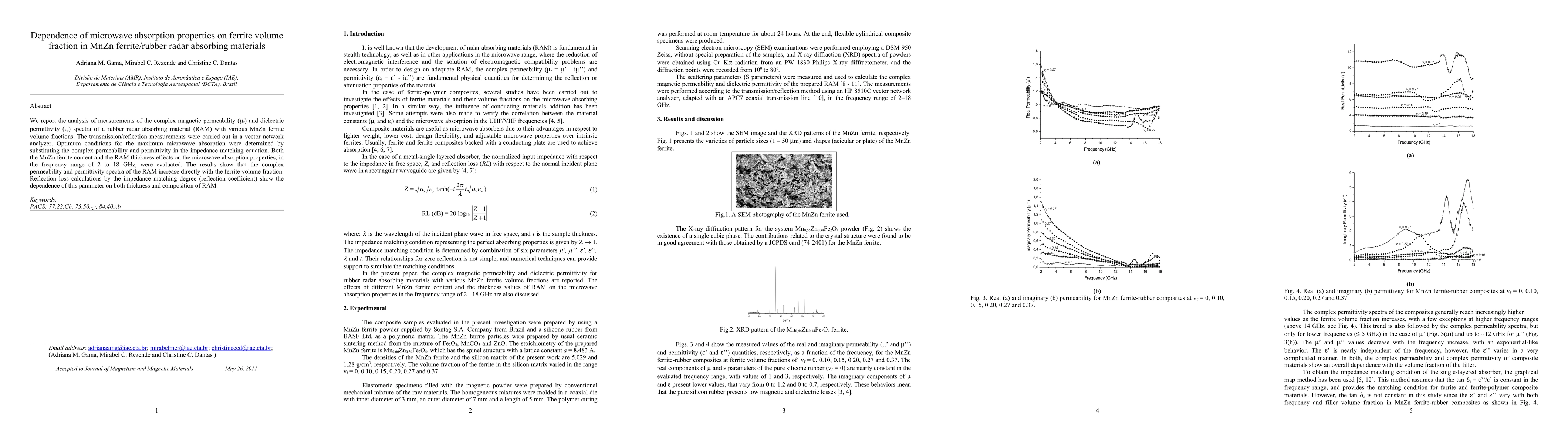 We report the analysis of measurements of the complex magnetic permeability ($\mu_r$) and dielectric permittivity ($\epsilon_r$) spectra of a rubber radar absorbing material (RAM) with various MnZn ferrite volume fractions. The transmission/reflection measurements were carried out in a vector network analyzer. Optimum conditions for the maximum microwave absorption were determined by substituting the complex permeability and permittivity in the impedance matching equation. Both the MnZn ferrite content and the RAM thickness effects on the microwave absorption properties, in the frequency range of 2 to 18 GHz, were evaluated. The results show that the complex permeability and permittivity spectra of the RAM increase directly with the ferrite volume fraction. Reflection loss calculations by the impedance matching degree (reflection coefficient) show the dependence of this parameter on both thickness and composition of RAM.