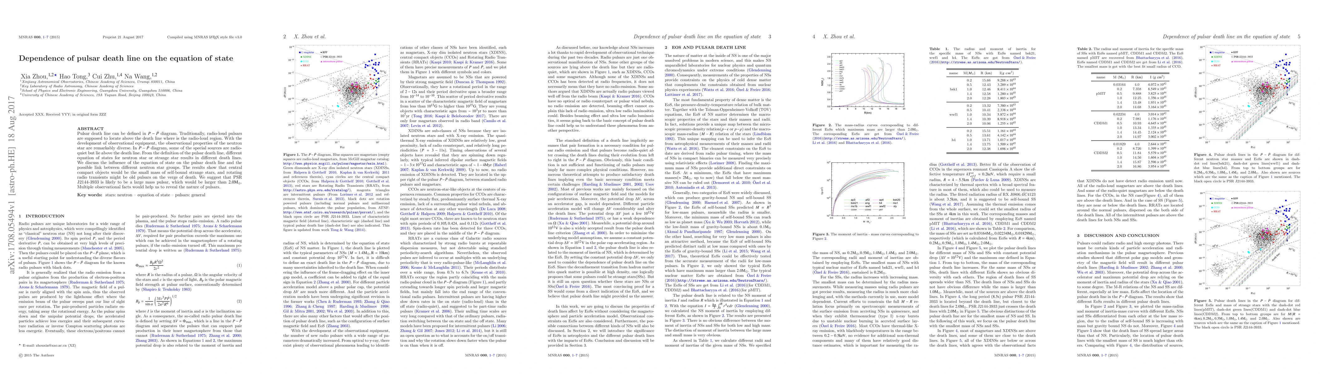 Pulsar death line can be defined in $P-\dot{P}$ diagram. Traditionally, radio-loud pulsars are supposed to locate above the death line where is the radio-loud region. With the development of observational equipment, the observational properties of the neutron star are remarkably diverse. In $P-\dot{P}$ diagram, some of the special sources are radio-quiet but lie above the death line. From the definition of the pulsar death line, different equation of states for neutron star or strange star results in different death lines. We discuss the influence of the equation of state on the pulsar death line and the possible link between different neutron star groups. The results show that central compact objects would be the small mass of self-bound strange stars, and rotating radio transients might be old pulsars on the verge of death. We suggest that PSR J2144-3933 is likely to be a large mass pulsar, which would be larger than $2.0\rm{M_{\odot}}$. Multiple observational facts would help us to reveal the nature of pulsars.