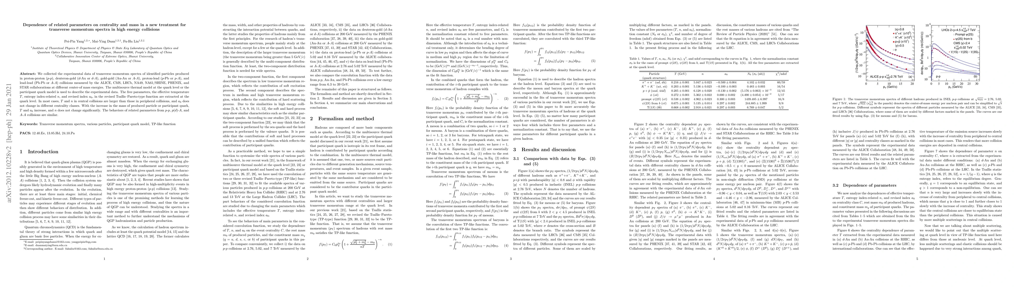 We collected the experimental data of transverse momentum spectra of identified particles produced in proton-proton ($p$-$p$), deuteron-gold ($d$-Au or $d$-$A$), gold-gold (Au-Au or $A$-$A$), proton-lead ($p$-Pb or $p$-$A$), and lead-lead (Pb-Pb or $A$-$A$) collisions measured by the ALICE, CMS, LHCb, NA49, NA61/SHINE, PHENIX, and STAR collaborations at different center-of mass energies. The multisource thermal model at the quark level or the participant quark model is used to describe the experimental data. The free parameters, the effective temperature $T$, entropy index-related $n$, and revised index $a_{0}$, in the revised Tsallis--Pareto-type function are extracted at the quark level. In most cases, $T$ and $n$ in central collisions are larger than those in peripheral collisions, and $a_0$ does not change in different centrality classes. With the increase in the mass of produced particle or participant quark, $T$ and $a_0$ increase, and $n$ does not change significantly. The behaviors of related parameters from $p$-$p$, $p(d)$-$A$, and $A$-$A$ collisions are similar.