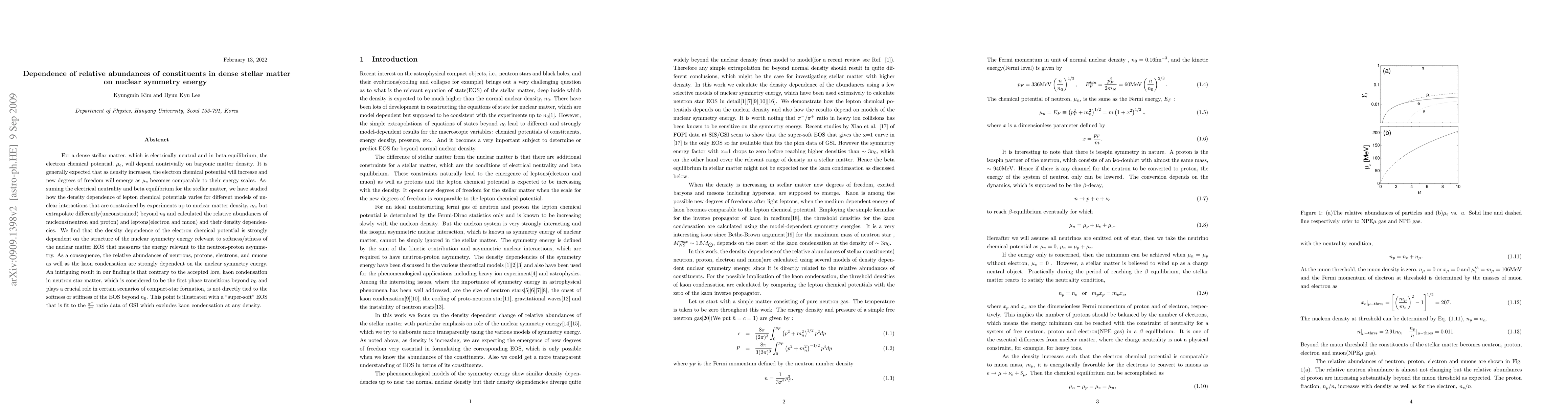 For a dense stellar matter, which is electrically neutral and in beta equilibrium, the electron chemical potential, mu_e, will depend nontrivially on baryonic matter density. It is generally expected that as density increases, the electron chemical potential will increase and new degrees of freedom will emerge as mu_e becomes comparable to their energy scales. Assuming the electrical neutrality and beta equilibrium for the stellar matter, we have studied how the density dependence of lepton chemical potentials varies for different models of nuclear interactions that are constrained by experiments up to nuclear matter density, n_0, but extrapolate differently(unconstrained) beyond n_0 and calculated the relative abundances of nucleons(neutron and proton) and leptons(electron and muon) and their density dependencies. We find that the density dependence of the electron chemical potential is strongly dependent on the structure of the nuclear symmetry energy relevant to softness/stfness of the nuclear matter EOS that measures the energy relevant to the neutron-proton asymmetry. As a consequence, the relative abundances of neutrons, protons, electrons, and muons as well as the kaon condensation are strongly dependent on the nuclear symmetry energy. An intriguing result in our finding is that contrary to the accepted lore, kaon condensation in neutron star matter, which is considered to be the first phase transitions beyond n_0 and plays a crucial role in certain scenarios of compact-star formation, is not directly tied to the softness or stiffness of the EOS beyond n_0. This point is illustrated with a "super-soft" EOS that is fit to the pi^-/pi^+ ratio data of GSI which excludes kaon condensation at any density.