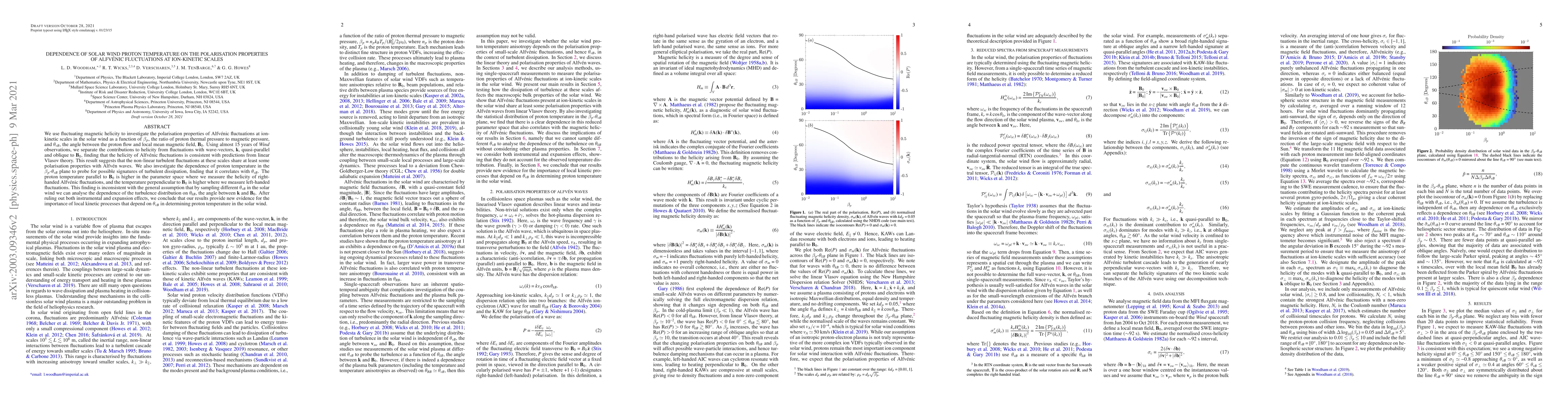 We use fluctuating magnetic helicity to investigate the polarisation properties of Alfv\'enic fluctuations at ion-kinetic scales in the solar wind as a function of $\beta_p$, the ratio of proton thermal pressure to magnetic pressure, and $\theta_{vB}$, the angle between the proton flow and local mean magnetic field, $\mathbf{B}_0$. Using almost 15 years of \textit{Wind} observations, we separate the contributions to helicity from fluctuations with wave-vectors, $\textbf{k}$, quasi-parallel and oblique to $\mathbf{B}_0$, finding that the helicity of Alfv\'enic fluctuations is consistent with predictions from linear Vlasov theory. This result suggests that the non-linear turbulent fluctuations at these scales share at least some polarisation properties with Alfv\'en waves. We also investigate the dependence of proton temperature in the $\beta_p$-$\theta_{vB}$ plane to probe for possible signatures of turbulent dissipation, finding that it correlates with $\theta_{vB}$. The proton temperature parallel to $\mathbf{B}_0$ is higher in the parameter space where we measure the helicity of right-handed Alfv\'enic fluctuations, and the temperature perpendicular to $\mathbf{B}_0$ is higher where we measure left-handed fluctuations. This finding is inconsistent with the general assumption that by sampling different $\theta_{vB}$ in the solar wind we can analyse the dependence of the turbulence distribution on $\theta_{kB}$, the angle between $\textbf{k}$ and $\mathbf{B}_0$. After ruling out both instrumental and expansion effects, we conclude that our results provide new evidence for the importance of local kinetic processes that depend on $\theta_{vB}$ in determining proton temperature in the solar wind.