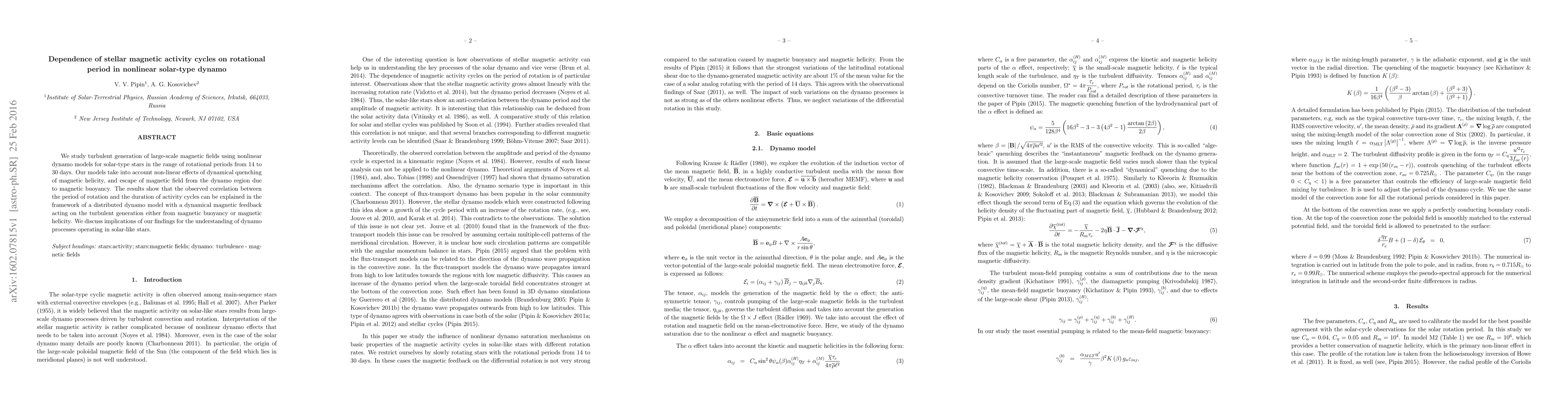 We study turbulent generation of large-scale magnetic fields using nonlinear dynamo models for solar-type stars in the range of rotational periods from 14 to 30 days. Our models take into account non-linear effects of dynamical quenching of magnetic helicity, and escape of magnetic field from the dynamo region due to magnetic buoyancy. The results show that the observed correlation between the period of rotation and the duration of activity cycles can be explained in the framework of a distributed dynamo model with a dynamical magnetic feedback acting on the turbulent generation either from magnetic buoyancy or magnetic helicity. We discuss implications of our findings for the understanding of dynamo processes operating in solar-like stars.