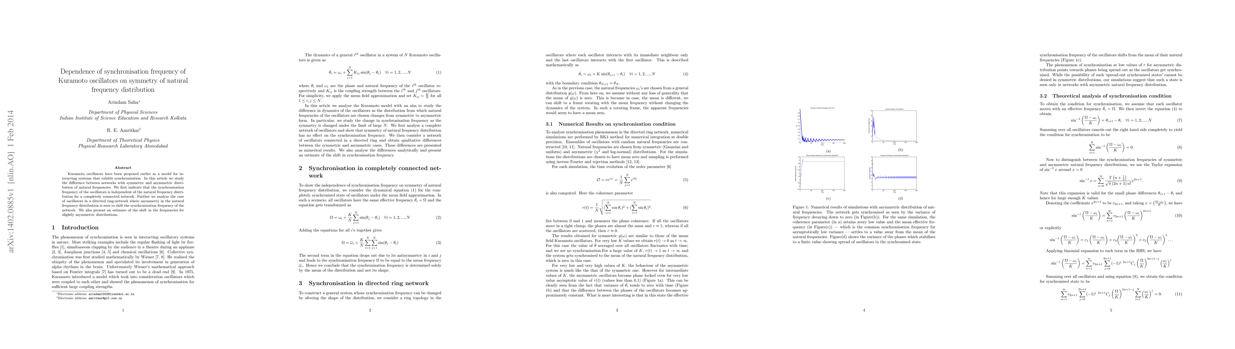 This paper investigates the impact of natural frequency distribution symmetry on the synchronisation frequency of Kuramoto oscillators, finding that in a fully connected network, synchronisation frequency remains unaffected by the distribution, but in a directed ring-network, asymmetry shifts the synchronisation frequency, with an estimate provided for small asymmetries.