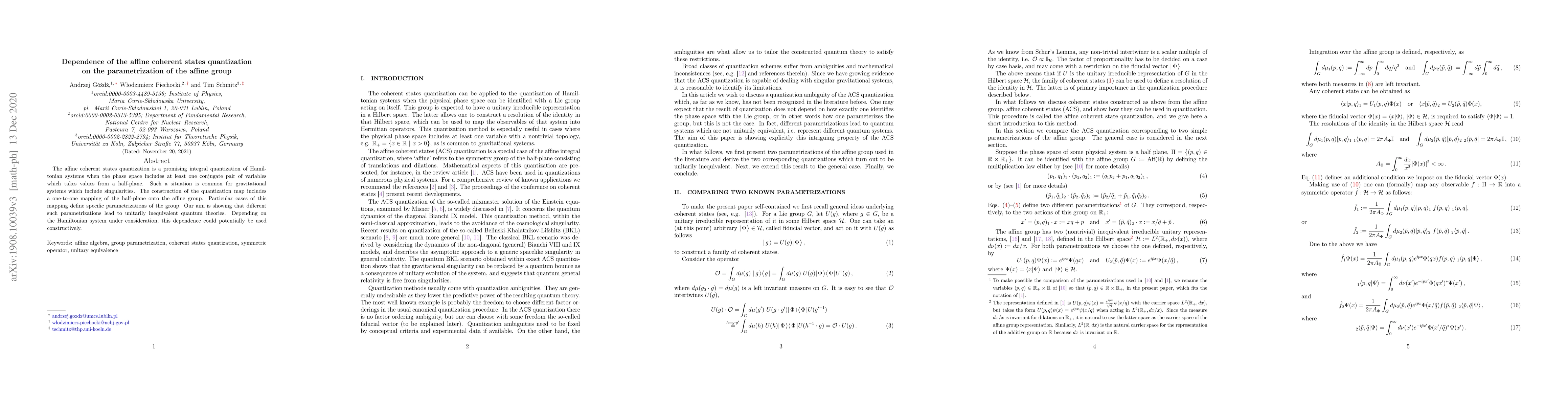 This paper investigates how the quantization of affine coherent states varies with different parametrizations of the affine group, demonstrating that these variations lead to unitarily inequivalent quantum theories, which could be exploited for specific Hamiltonian systems, such as those involving gravitational singularities.