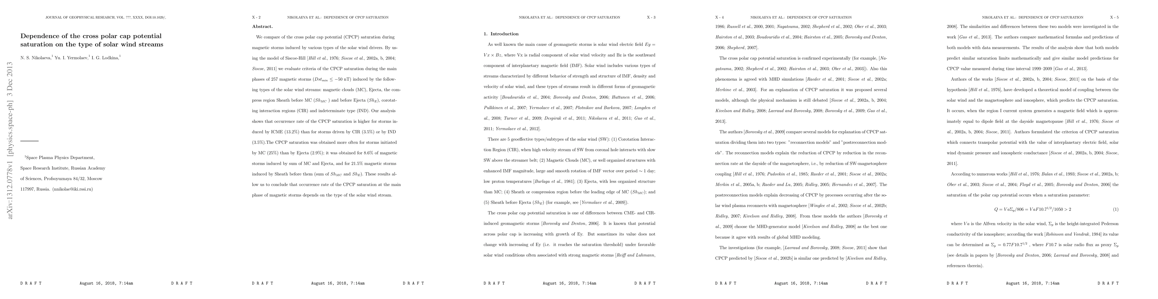 We compare of the cross polar cap potential (CPCP) saturation during magnetic storms induced by various types of the solar wind drivers. By using the model of Siscoe-Hill \citep{Hilletal1976,Siscoeetal2002a,Siscoeetal2002b,Siscoeetal2004,Siscoe2011} we evaluate criteria of the CPCP saturation during the main phases of 257 magnetic storms ($Dst_{min} \le -50$ nT) induced by the following types of the solar wind streams: magnetic clouds (MC), Ejecta, the compress region Sheath before MC ($Sh_{MC}$) and before Ejecta ($Sh_{E}$), corotating interaction regions (CIR) and indeterminate type (IND). Our analysis shows that occurrence rate of the CPCP saturation is higher for storms induced by ICME ($13.2%$) than for storms driven by CIR ($3.5%$) or by IND ($3.5%$).The CPCP saturation was obtained more often for storms initiated by MC ($25%$) than by Ejecta ($2.9%$); it was obtained for $8.6%$ of magnetic storms induced by sum of MC and Ejecta, and for $21.5%$ magnetic storms induced by Sheath before them (sum of $Sh_{MC}$ and $Sh_{E}$). These results allow us to conclude that occurrence rate of the CPCP saturation at the main phase of magnetic storms depends on the type of the solar wind stream.