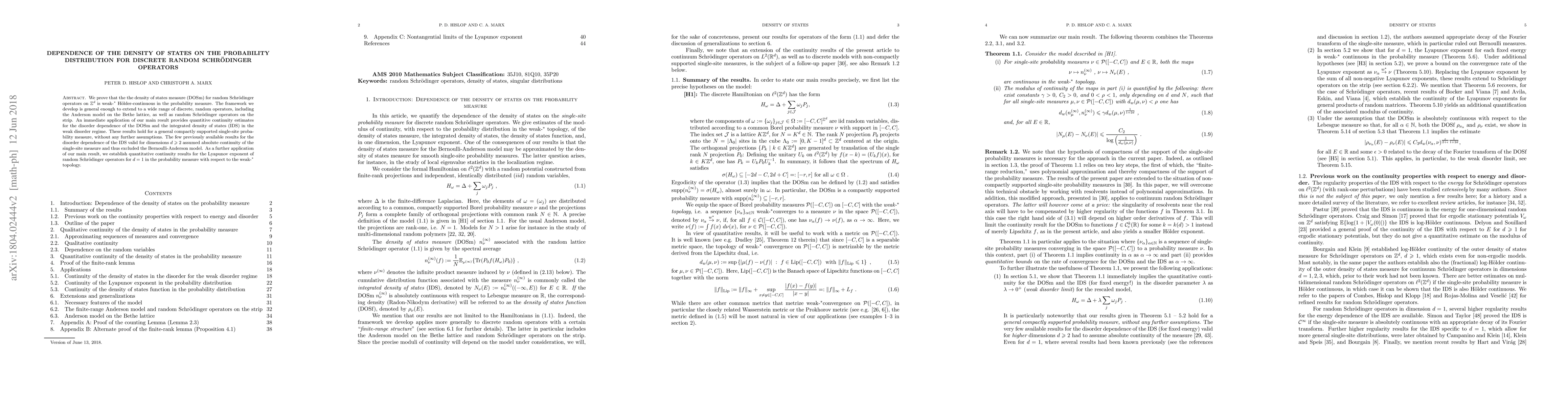 This paper proves the weak-$^*$ H\"older-continuity of the density of states measure for random Schr\"odinger operators on $\mathbb{Z}^d$, extending to various discrete random operators. It provides quantitative continuity estimates for the disorder dependence of the density of states and integrated density of states in the weak disorder regime, applicable to general compactly supported single-site probability measures.