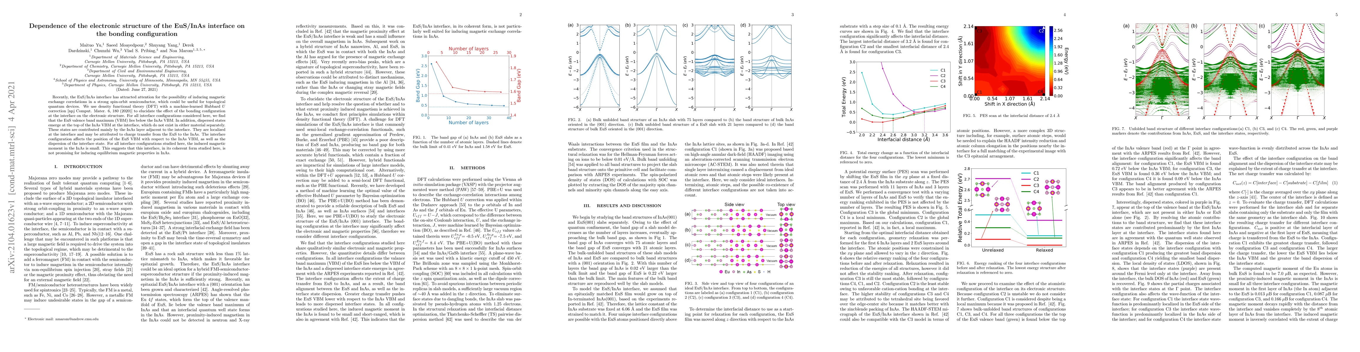 Recently, the EuS/InAs interface has attracted attention for the possibility of inducing magnetic exchange correlations in a strong spin-orbit semiconductor, which could be useful for topological quantum devices. We use density functional theory (DFT) with a machine-learned Hubbard $U$ correction [npj Comput. Mater. 6, 180 (2020)] to elucidate the effect of the bonding configuration at the interface on the electronic structure. For all interface configurations considered here, we find that the EuS valence band maximum (VBM) lies below the InAs VBM. In addition, dispersed states emerge at the top of the InAs VBM at the interface, which do not exist in either material separately. These states are contributed mainly by the InAs layer adjacent to the interface. They are localized at the interface and may be attributed to charge transfer from the EuS to the InAs. The interface configuration affects the position of the EuS VBM with respect to the InAs VBM, as well as the dispersion of the interface state. For all interface configurations studied here, the induced magnetic moment in the InAs is small. This suggests that this interface, in its coherent form studied here, is not promising for inducing equilibrium magnetic properties in InAs.