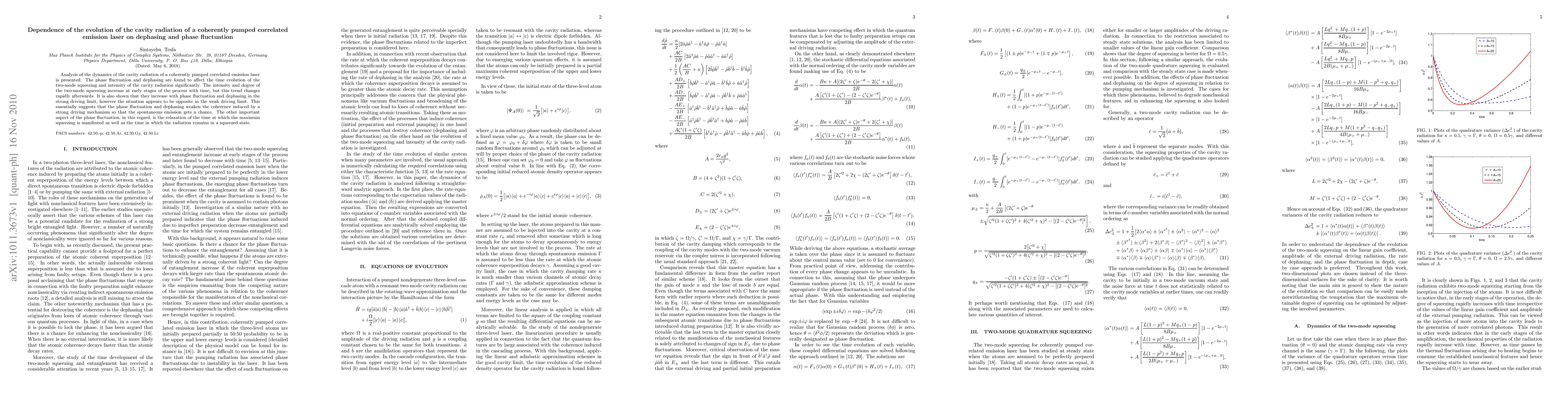 This paper investigates how phase fluctuations and dephasing influence the dynamics of cavity radiation in a coherently pumped correlated emission laser. It finds that these factors significantly affect the evolution of two-mode squeezing and radiation intensity, with their effects varying depending on the strength of the driving mechanism.