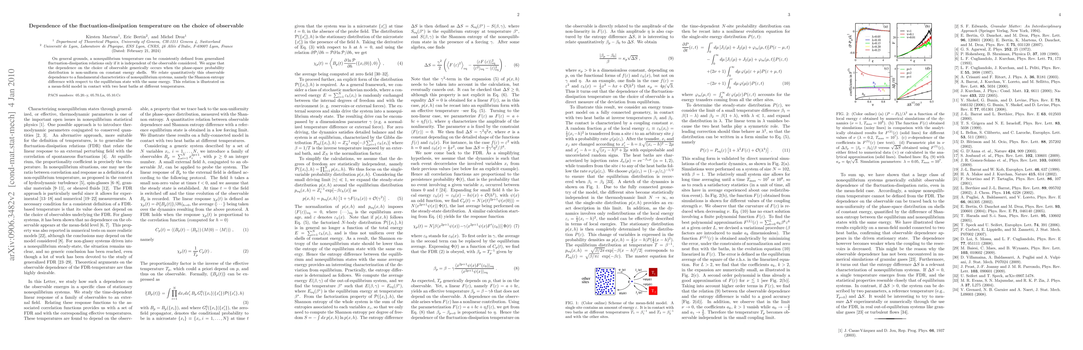 This paper argues that the fluctuation-dissipation temperature in nonequilibrium systems depends on the chosen observable when the phase-space distribution is non-uniform. The dependence is quantitatively linked to the Shannon entropy difference relative to the equilibrium state with the same energy, demonstrated through a mean-field model.