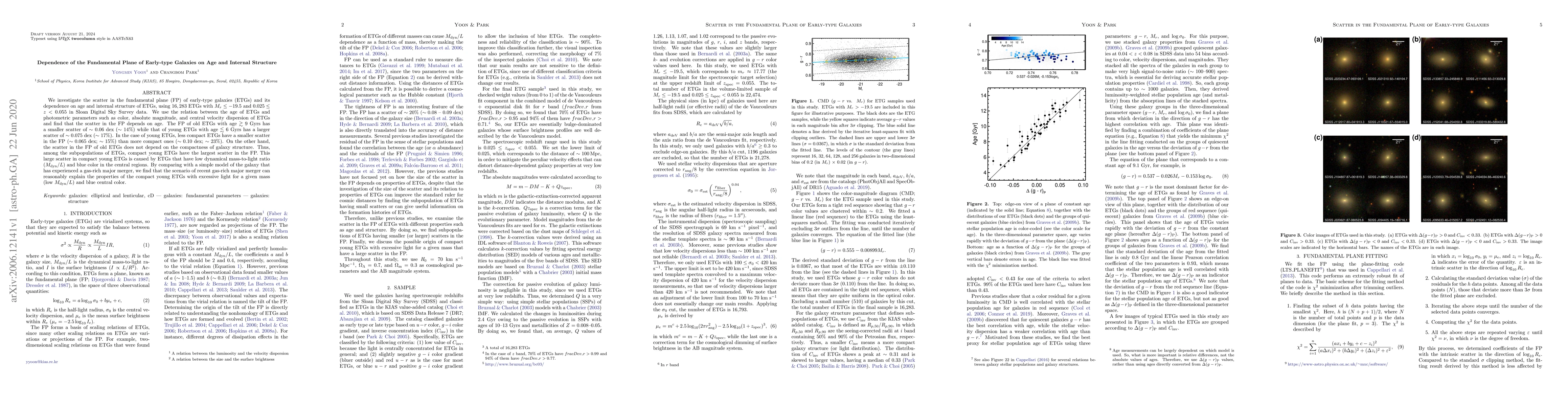 Research on early-type galaxies found that the scatter in their fundamental plane depends on age and internal structure, with older, less compact galaxies having a smaller scatter.