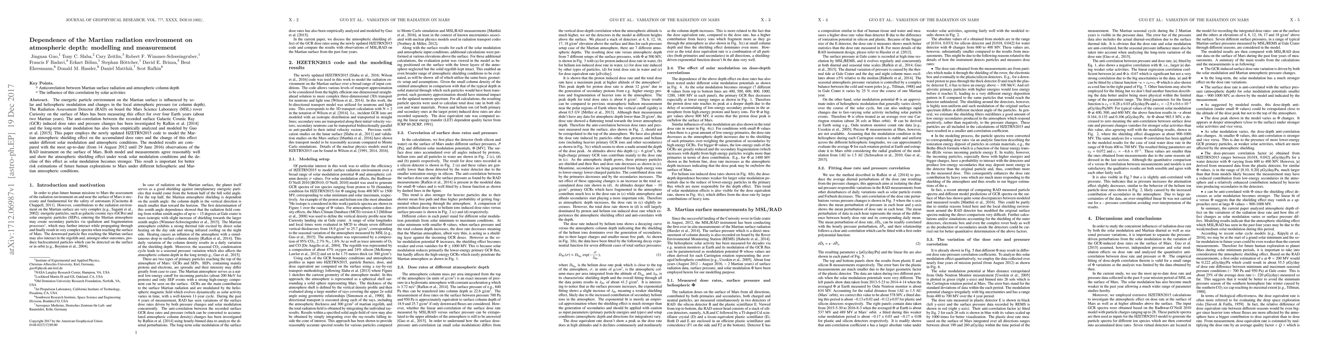 This paper models and measures the Martian radiation environment's dependence on atmospheric depth, using the RAD instrument's data and the HZETRN2015 code. Results show a correlation between atmospheric pressure changes and Galactic Cosmic Ray-induced dose rates, crucial for assessing risks for future human missions.