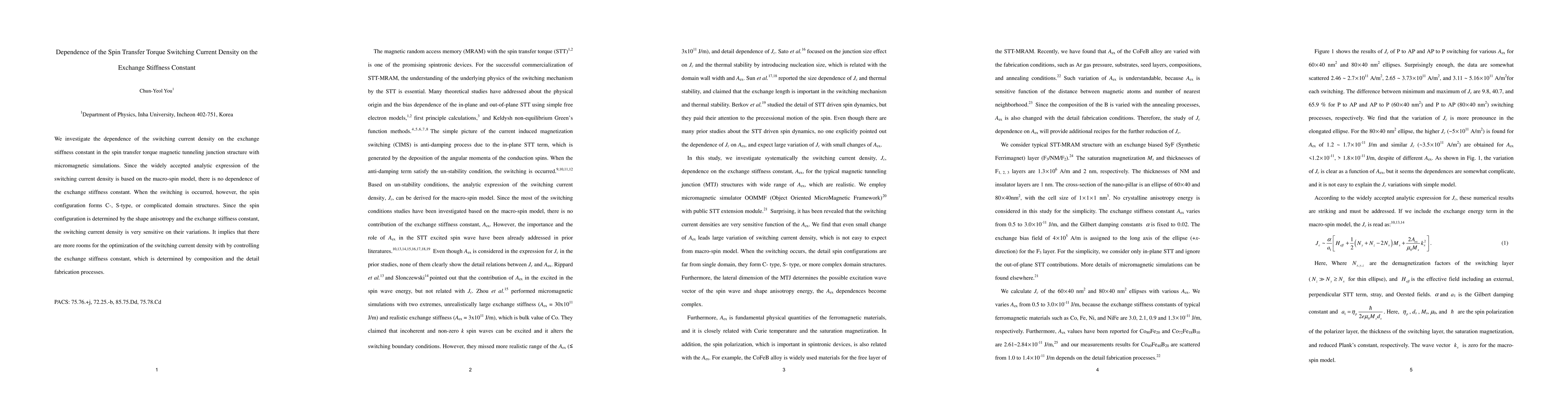 We investigate the dependence of the switching current density on the exchange stiffness constant in the spin transfer torque magnetic tunneling junction structure with micromagnetic simulations. Since the widely accepted analytic expression of the switching current density is based on the macro-spin model, there is no dependence of the exchange stiffness constant. When the switching is occurred, however, the spin configuration forms C-, S-type, or complicated domain structures. Since the spin configuration is determined by the shape anisotropy and the exchange stiffness constant, the switching current density is very sensitive on their variations. It implies that there are more rooms for the optimization of the switching current density with by controlling the exchange stiffness constant, which is determined by composition and the detail fabrication processes.