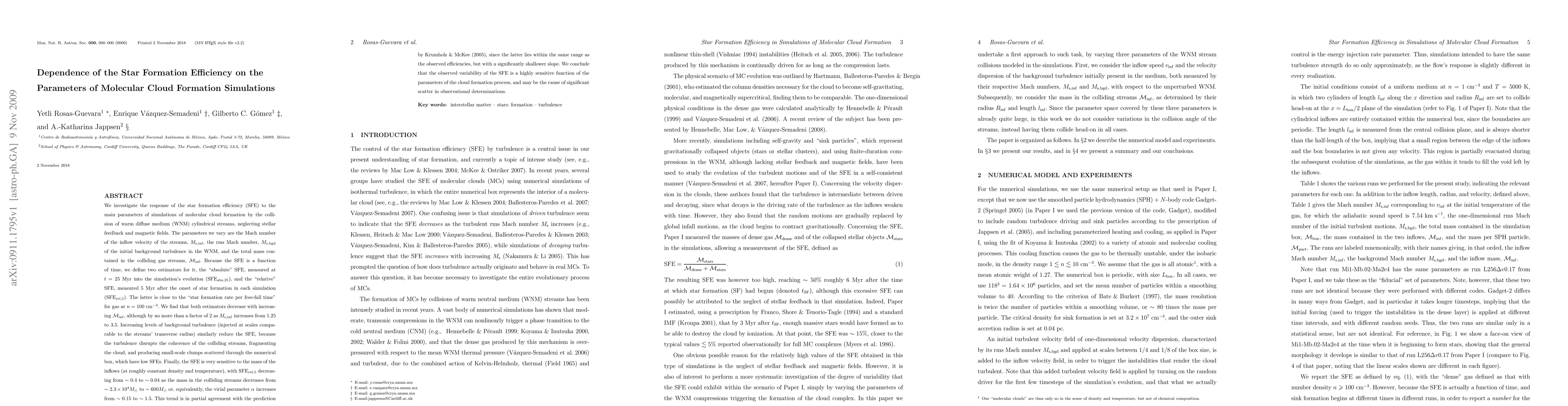 The star formation efficiency in molecular cloud simulations decreases with increasing stream mass, background turbulence, and inflow velocity, revealing a highly sensitive relationship to the cloud formation process parameters.