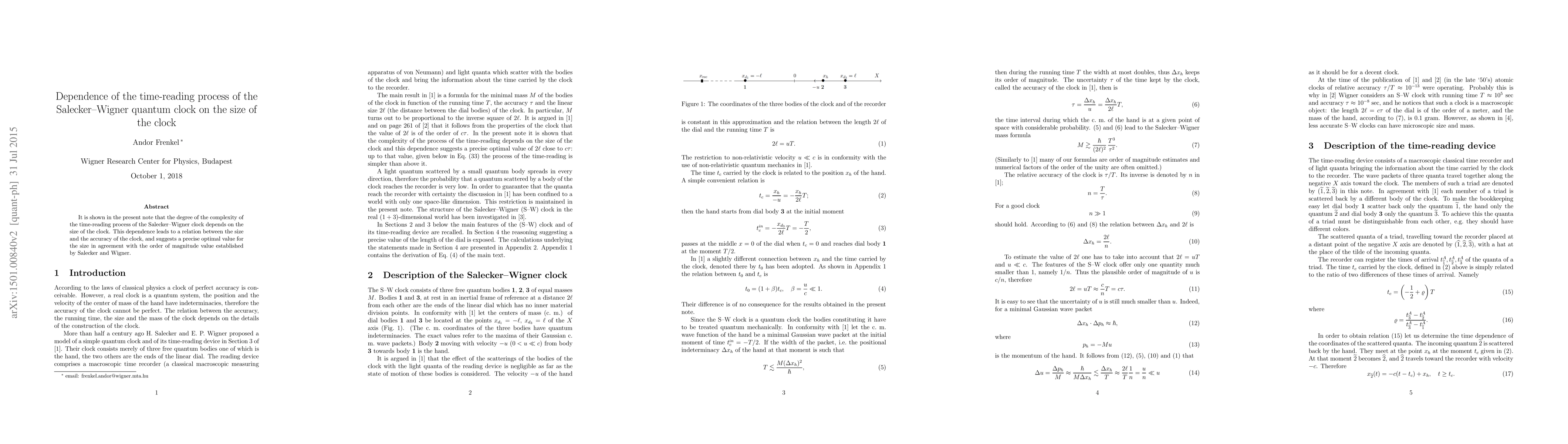 It is shown in the present note that the degree of the complexity of the time-reading process of the Salecker--Wigner clock depends on the size of the clock. This dependence leads to a relation between the size and the accuracy of the clock, and suggests a precise optimal value for the size in agreement with the order of magnitude value established by Salecker and Wigner.