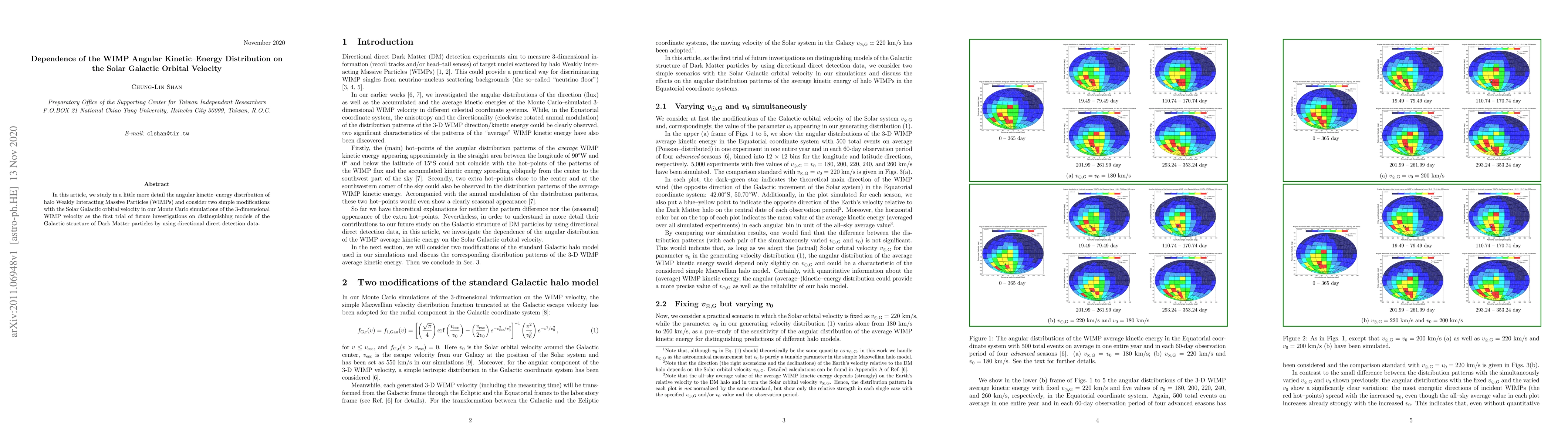 In this article, we study in a little more detail the angular kinetic-energy distribution of halo Weakly Interacting Massive Particles (WIMPs) and consider two simple modifications with the Solar Galactic orbital velocity in our Monte Carlo simulations of the 3-dimensional WIMP velocity as the first trial of future investigations on distinguishing models of the Galactic structure of Dark Matter particles by using directional direct detection data.