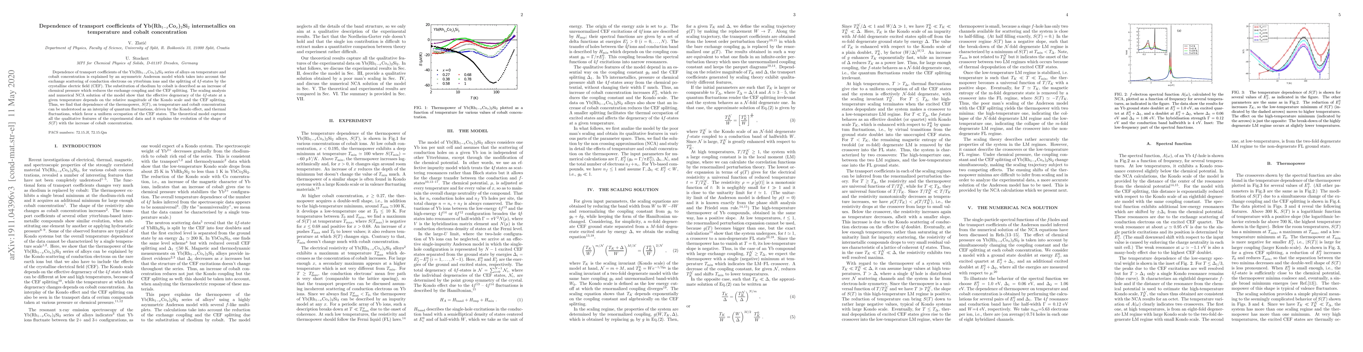 Dependence of transport coefficients of the Yb(Rh$_{1-x}$Co$_x$)$_2$Si$_2$ series of alloys on temperature and cobalt concentration is explained by an asymmetric Anderson model which takes into account the exchange scattering of conduction electrons on ytterbium ions and the splitting of 4$f$-states by the crystalline electric field (CEF). The substitution of rhodium by cobalt is described as an increase of chemical pressure which reduces the exchange coupling and the CEF splitting. The scaling analysis and numerical NCA solution of the model show that the effective degeneracy of the 4$f$-state at a given temperature depends on the relative magnitude of the Kondo scale and the CEF splitting. Thus, we find that dependence of the thermopower, $S(T)$, on temperature and cobalt concentration can be understood as an interplay of quantum fluctuations, driven by the Kondo effect, and thermal fluctuations, which favor a uniform occupation of the CEF states. The theoretical model captures all the qualitative features of the experimental data and it explains the evolution of the shape of $S(T)$ with the increase of cobalt concentration.