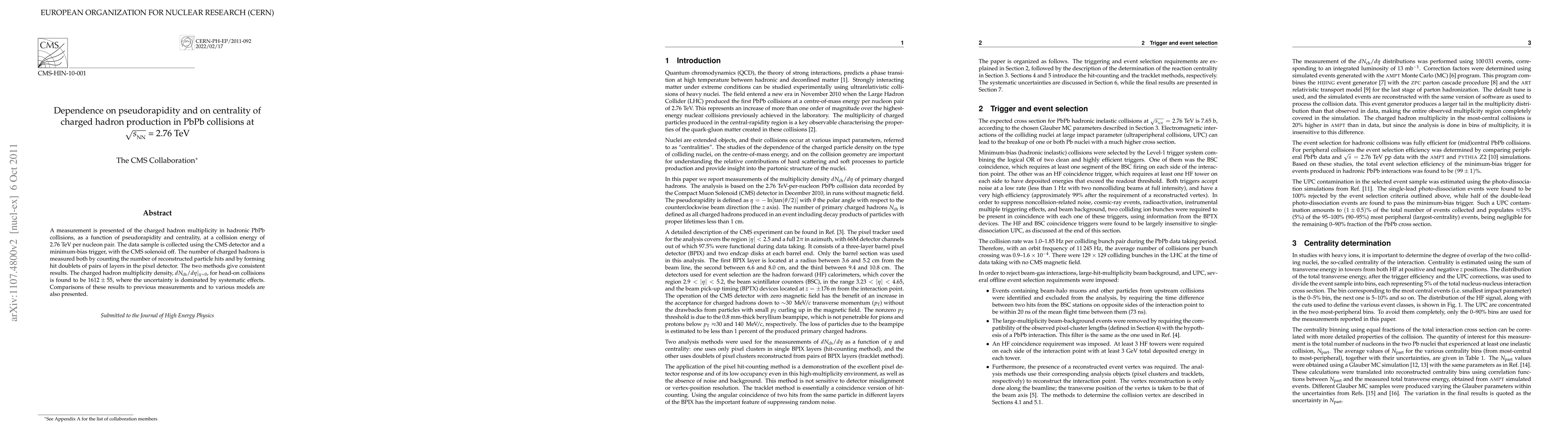 A measurement is presented of the charged hadron multiplicity in hadronic PbPb collisions, as a function of pseudorapidity and centrality, at a collision energy of 2.76 TeV per nucleon pair. The data sample is collected using the CMS detector and a minimum-bias trigger, with the CMS solenoid off. The number of charged hadrons is measured both by counting the number of reconstructed particle hits and by forming hit doublets of pairs of layers in the pixel detector. The two methods give consistent results. The charged hadron multiplicity density dN(ch)/d eta, evaluated at eta=0 for head-on collisions, is found to be 1612 +/- 55, where the uncertainty is dominated by systematic effects. Comparisons of these results to previous measurements and to various models are also presented.