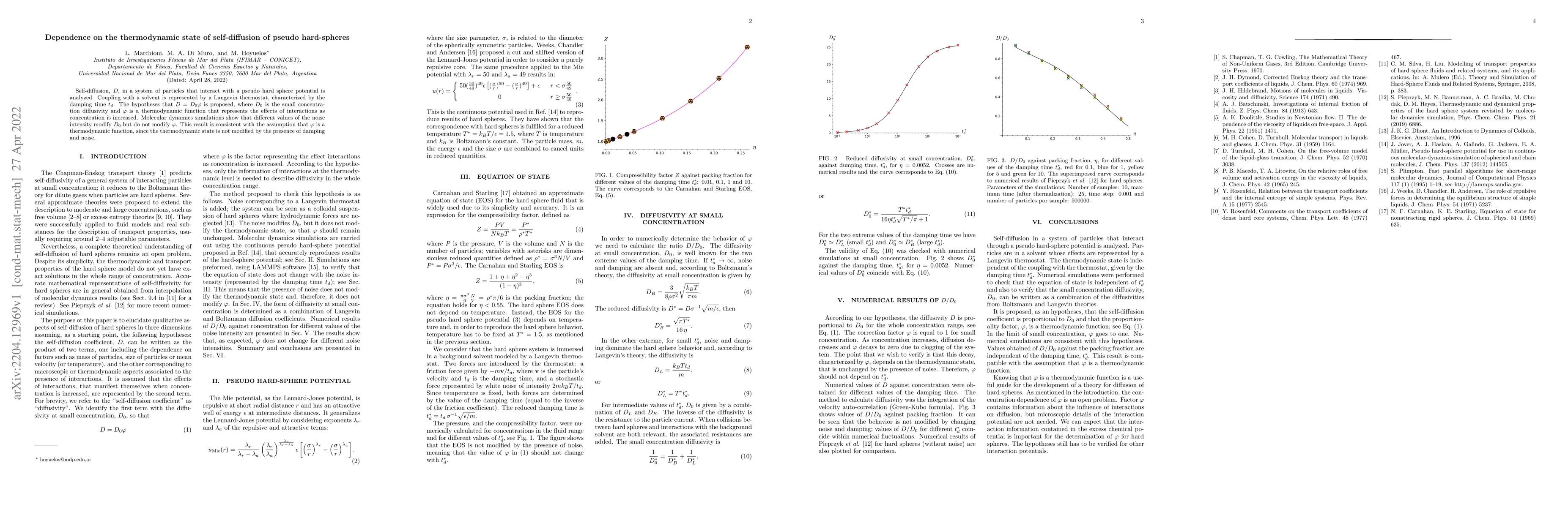 Self-diffusion, $D$, in a system of particles that interact with a pseudo hard sphere potential is analyzed. Coupling with a solvent is represented by a Langevin thermostat, characterized by the damping time $t_d$. The hypotheses that $D=D_0 \varphi$ is proposed, where $D_0$ is the small concentration diffusivity and $\varphi$ is a thermodynamic function that represents the effects of interactions as concentration is increased. Molecular dynamics simulations show that different values of the noise intensity modify $D_0$ but do not modify $\varphi$. This result is consistent with the assumption that $\varphi$ is a thermodynamic function, since the thermodynamic state is not modified by the presence of damping and noise.