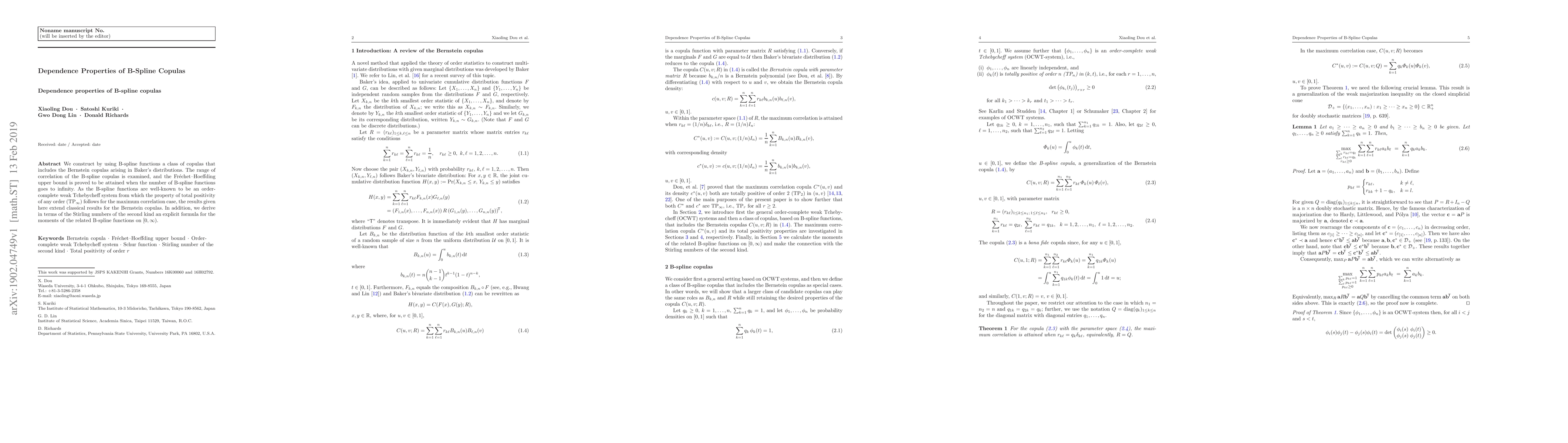 We construct by using B-spline functions a class of copulas that includes the Bernstein copulas arising in Baker's distributions. The range of correlation of the B-spline copulas is examined, and the Frechet--Hoeffding upper bound is proved to be attained when the number of B-spline functions goes to infinity. As the B-spline functions are well-known to be an order-complete weak Tchebycheff system from which the property of total positivity of any order follows for the maximum correlation case, the results given here extend classical results for the Bernstein copulas. In addition, we derive in terms of the Stirling numbers of the second kind an explicit formula for the moments of the related B-spline functions for nonnegative real numbers.