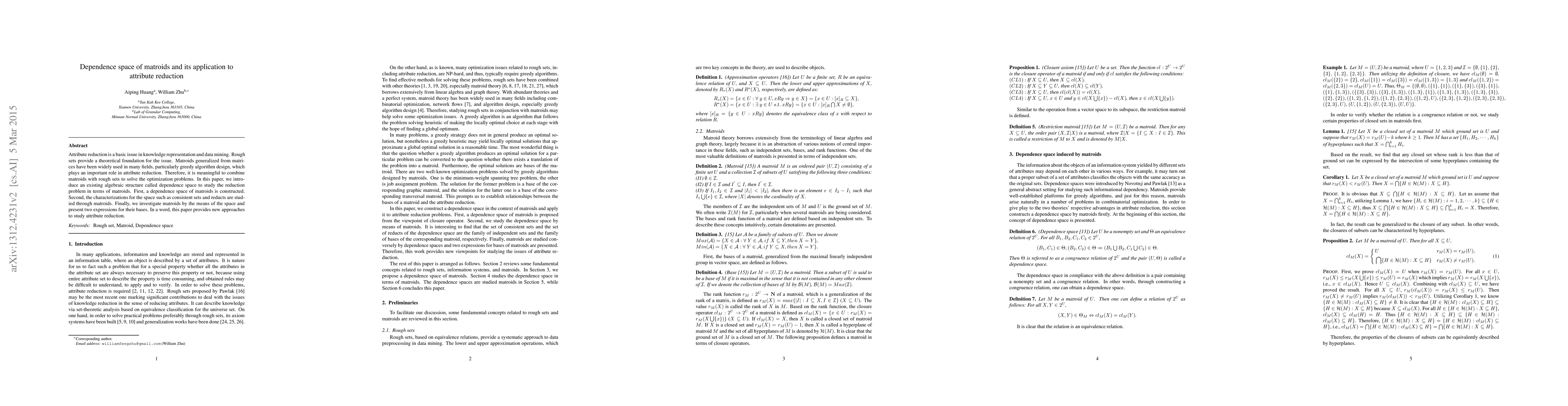 This paper combines matroids and rough sets to address attribute reduction in knowledge representation and data mining. It constructs a dependence space of matroids, characterizes it using consistent sets and reducts, and presents new expressions for matroid bases to offer innovative approaches to attribute reduction.