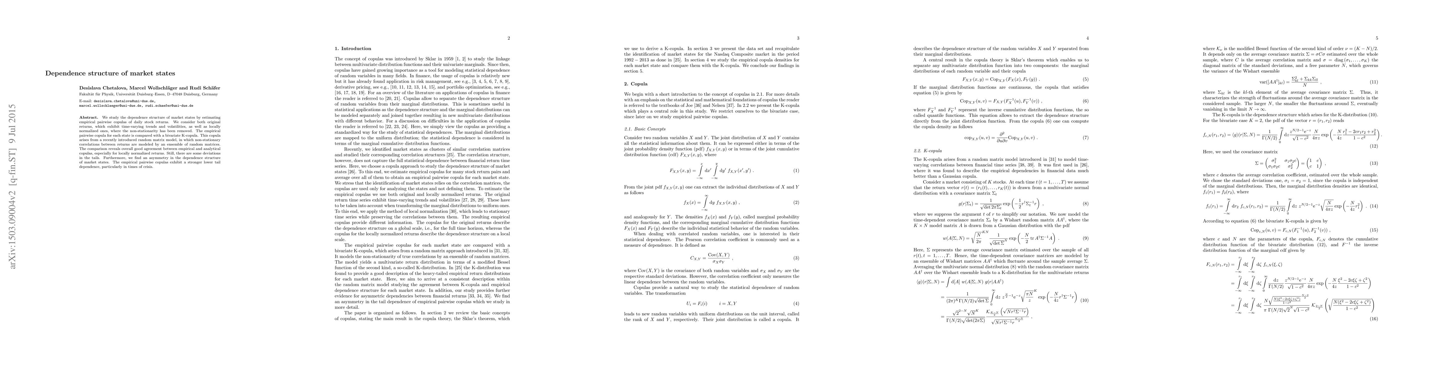 This paper examines the dependence structure of market states using empirical pairwise copulas of daily stock returns, comparing them to a bivariate K-copula from a random matrix model. It finds good agreement between empirical and analytical copulas, especially for normalized returns, but notes stronger lower tail dependence, particularly in crisis times.
