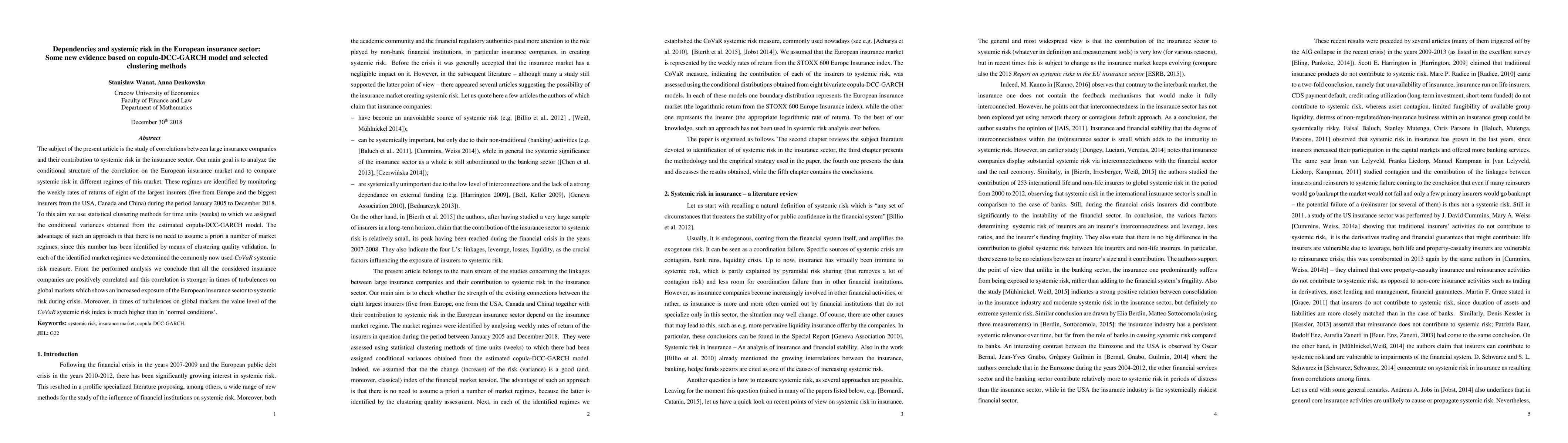 The subject of the present article is the study of correlations between large insurance companies and their contribution to systemic risk in the insurance sector. Our main goal is to analyze the conditional structure of the correlation on the European insurance market and to compare systemic risk in different regimes of this market. These regimes are identified by monitoring the weekly rates of returns of eight of the largest insurers (five from Europe and the biggest insurers from the USA, Canada and China) during the period January 2005 to December 2018. To this aim we use statistical clustering methods for time units (weeks) to which we assigned the conditional variances obtained from the estimated copula-DCC-GARCH model. The advantage of such an approach is that there is no need to assume a priori a number of market regimes, since this number has been identified by means of clustering quality validation. In each of the identified market regimes we determined the commonly now used CoVaR systemic risk measure. From the performed analysis we conclude that all the considered insurance companies are positively correlated and this correlation is stronger in times of turbulences on global markets which shows an increased exposure of the European insurance sector to systemic risk during crisis. Moreover, in times of turbulences on global markets the value level of the CoVaR systemic risk index is much higher than in "normal conditions".