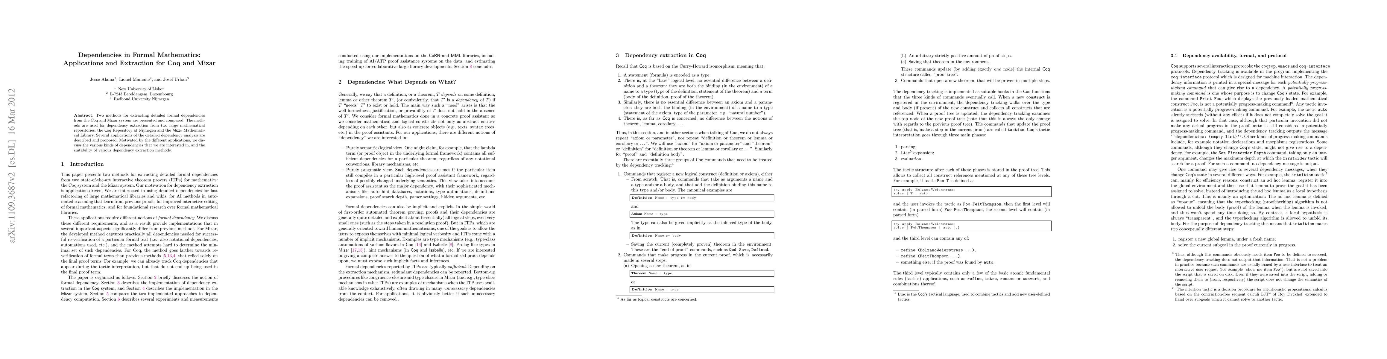 Two methods for extracting detailed formal dependencies from the Coq and Mizar system are presented and compared. The methods are used for dependency extraction from two large mathematical repositories: the Coq Repository at Nijmegen and the Mizar Mathematical Library. Several applications of the detailed dependency analysis are described and proposed. Motivated by the different applications, we discuss the various kinds of dependencies that we are interested in,and the suitability of various dependency extraction methods.