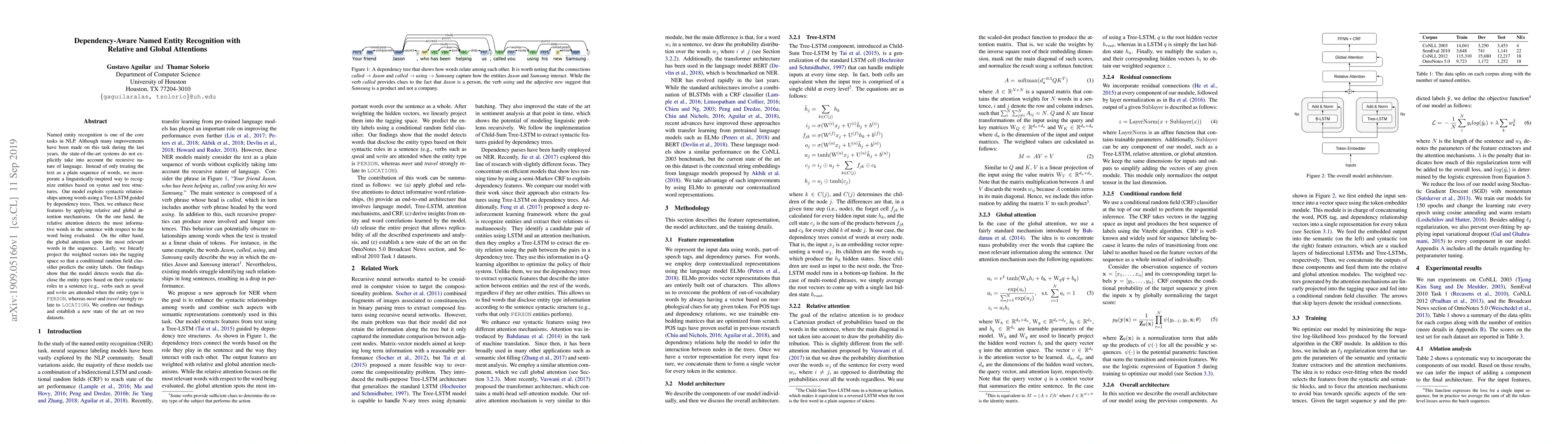 This paper proposes a dependency-aware named entity recognition model that leverages syntactic relationships through Tree-LSTMs guided by dependency trees, enhanced by relative and global attention mechanisms. The model achieves state-of-the-art results by detecting entity types based on syntactic roles and outperforms existing methods on two datasets.