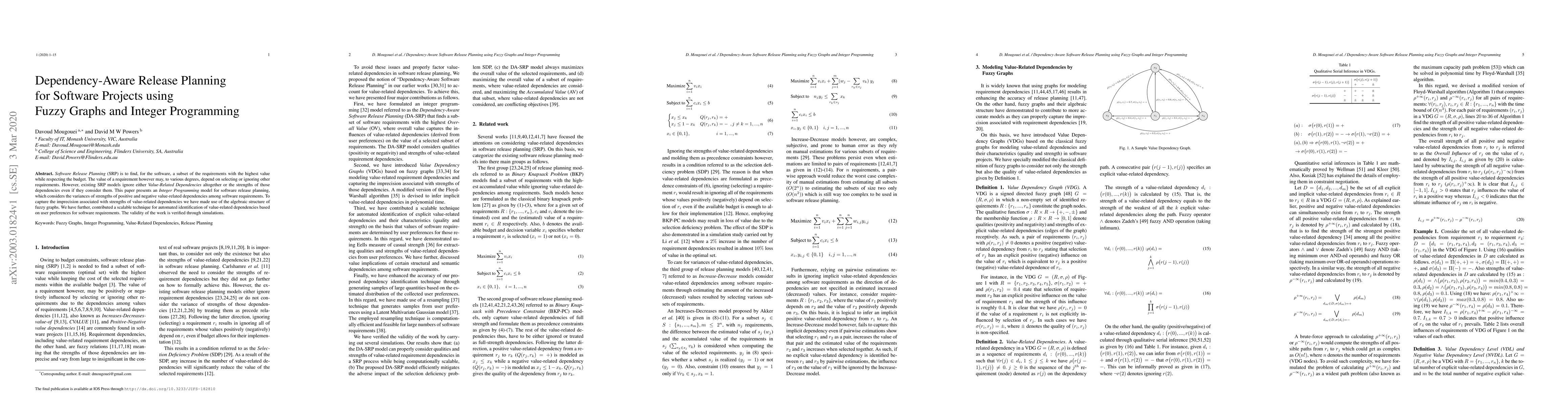 This paper proposes an Integer Programming model for software release planning that accounts for the strengths of value-related dependencies among software requirements using fuzzy graphs. It also introduces a scalable method for identifying these dependencies based on user preferences, validated through simulations.