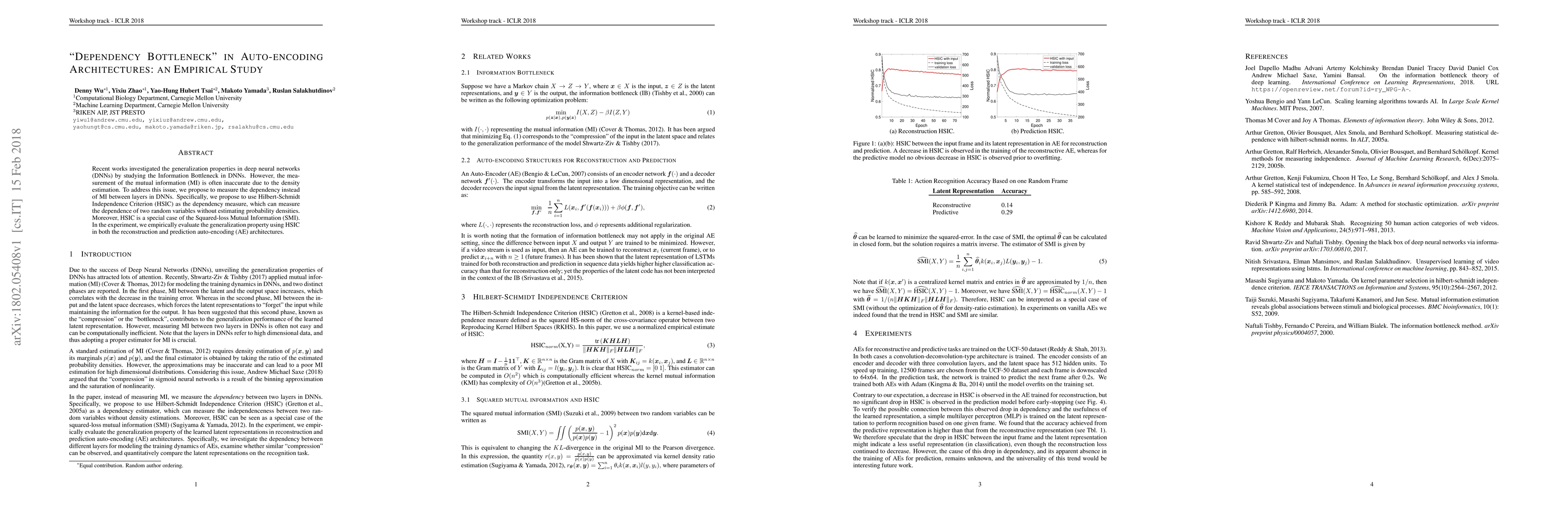 This paper proposes using Hilbert-Schmidt Independence Criterion (HSIC) to measure dependency between layers in deep neural networks instead of mutual information, addressing inaccuracies due to density estimation. The study empirically evaluates the generalization properties of auto-encoding architectures using HSIC.