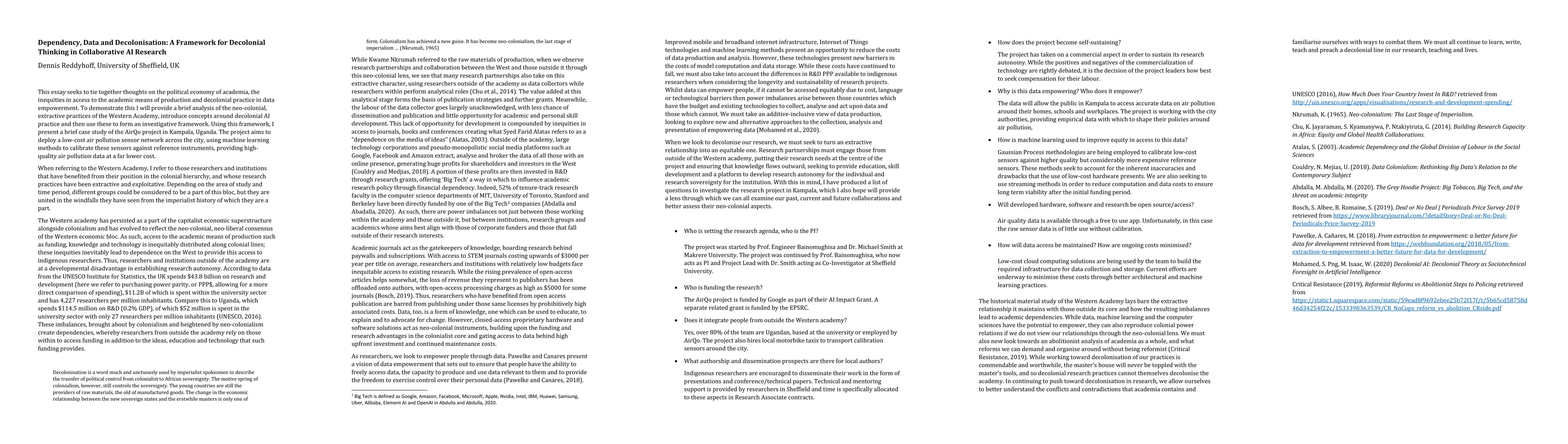 This essay seeks to tie together thoughts on the political economy of academia, the inequities in access to the academic means of production and decolonial practice in data empowerment. To demonstrate this I will provide a brief analysis of the neo-colonial, extractive practices of the Western Academy, introduce concepts around decolonial AI practice and then use these to form an investigative framework. Using this framework, I present a brief case study of the AirQo project in Kampala, Uganda. The project aims to deploy a low-cost air pollution sensor network across the city, using machine learning methods to calibrate these sensors against reference instruments, providing high-quality air pollution data at a far lower cost.
