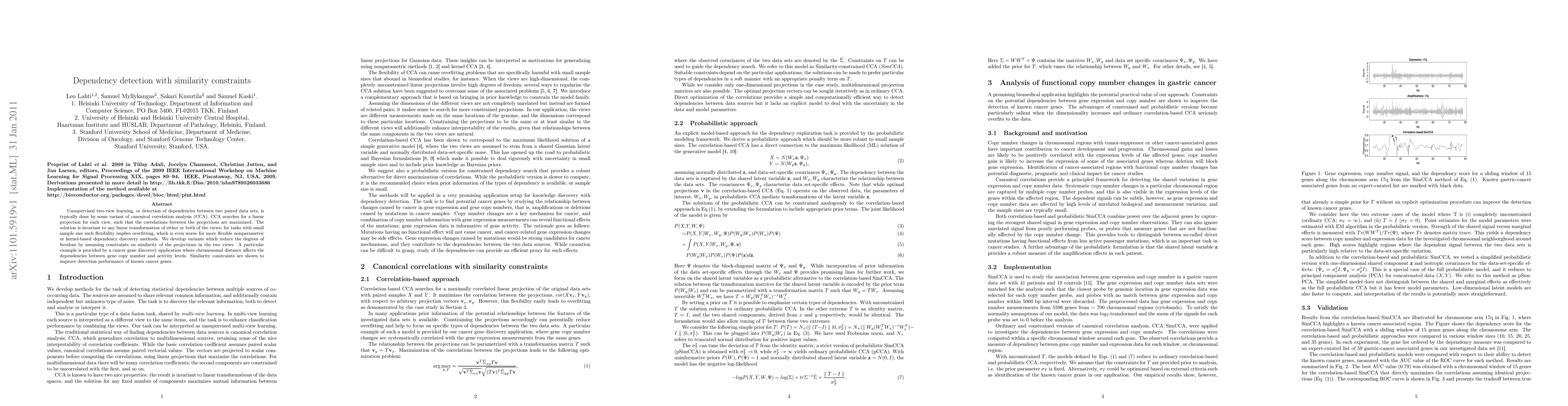 Unsupervised two-view learning, or detection of dependencies between two paired data sets, is typically done by some variant of canonical correlation analysis (CCA). CCA searches for a linear projection for each view, such that the correlations between the projections are maximized. The solution is invariant to any linear transformation of either or both of the views; for tasks with small sample size such flexibility implies overfitting, which is even worse for more flexible nonparametric or kernel-based dependency discovery methods. We develop variants which reduce the degrees of freedom by assuming constraints on similarity of the projections in the two views. A particular example is provided by a cancer gene discovery application where chromosomal distance affects the dependencies between gene copy number and activity levels. Similarity constraints are shown to improve detection performance of known cancer genes.