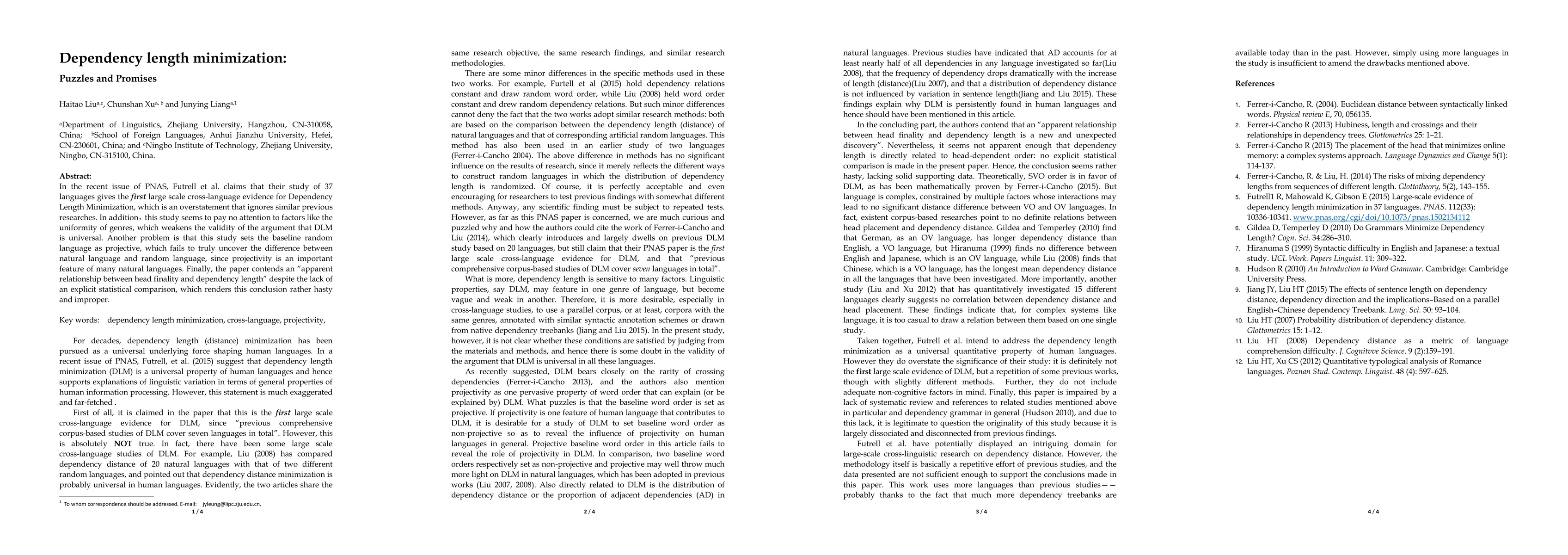 In the recent issue of PNAS, Futrell et al. claims that their study of 37 languages gives the first large scale cross-language evidence for Dependency Length Minimization, which is an overstatement that ignores similar previous researches. In addition,this study seems to pay no attention to factors like the uniformity of genres,which weakens the validity of the argument that DLM is universal. Another problem is that this study sets the baseline random language as projective, which fails to truly uncover the difference between natural language and random language, since projectivity is an important feature of many natural languages. Finally, the paper contends an "apparent relationship between head finality and dependency length" despite the lack of an explicit statistical comparison, which renders this conclusion rather hasty and improper.