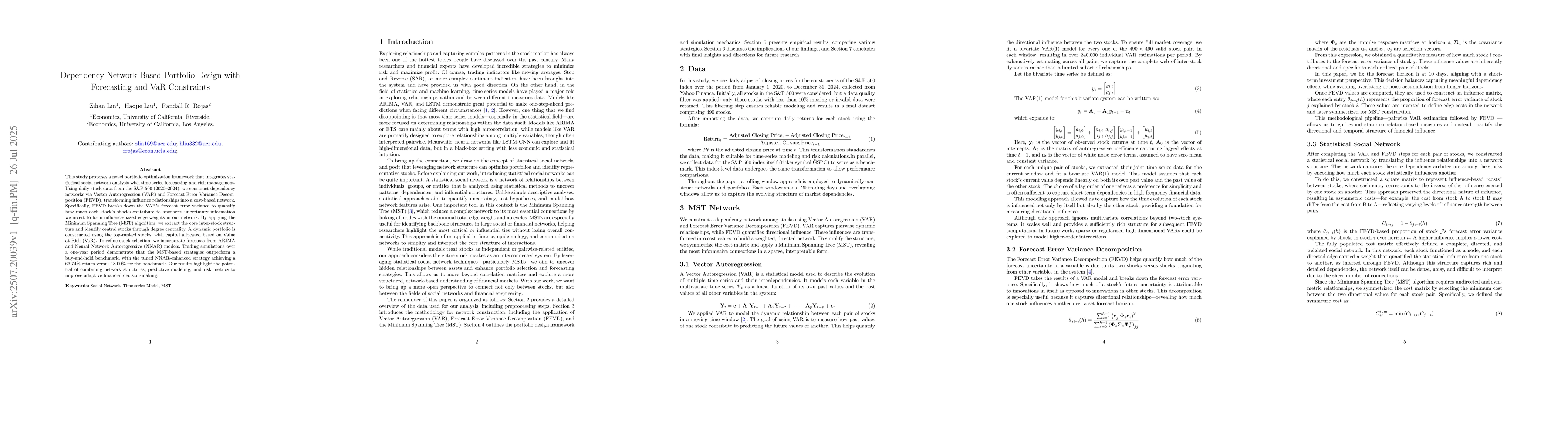 This study proposes a novel portfolio optimization framework that integrates statistical social network analysis with time series forecasting and risk management. Using daily stock data from the S&P 500 (2020-2024), we construct dependency networks via Vector Autoregression (VAR) and Forecast Error Variance Decomposition (FEVD), transforming influence relationships into a cost-based network. Specifically, FEVD breaks down the VAR's forecast error variance to quantify how much each stock's shocks contribute to another's uncertainty information we invert to form influence-based edge weights in our network. By applying the Minimum Spanning Tree (MST) algorithm, we extract the core inter-stock structure and identify central stocks through degree centrality. A dynamic portfolio is constructed using the top-ranked stocks, with capital allocated based on Value at Risk (VaR). To refine stock selection, we incorporate forecasts from ARIMA and Neural Network Autoregressive (NNAR) models. Trading simulations over a one-year period demonstrate that the MST-based strategies outperform a buy-and-hold benchmark, with the tuned NNAR-enhanced strategy achieving a 63.74% return versus 18.00% for the benchmark. Our results highlight the potential of combining network structures, predictive modeling, and risk metrics to improve adaptive financial decision-making.