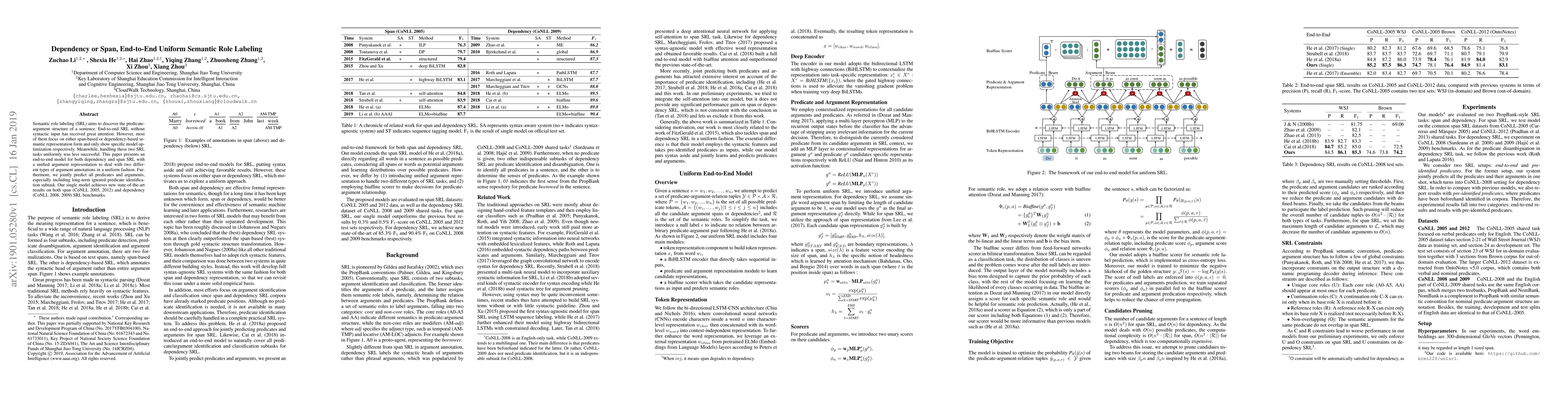 This paper introduces an end-to-end model for uniform semantic role labeling (SRL) that jointly handles both dependency and span representations, achieving state-of-the-art results on multiple SRL benchmarks while addressing previously neglected predicate identification.