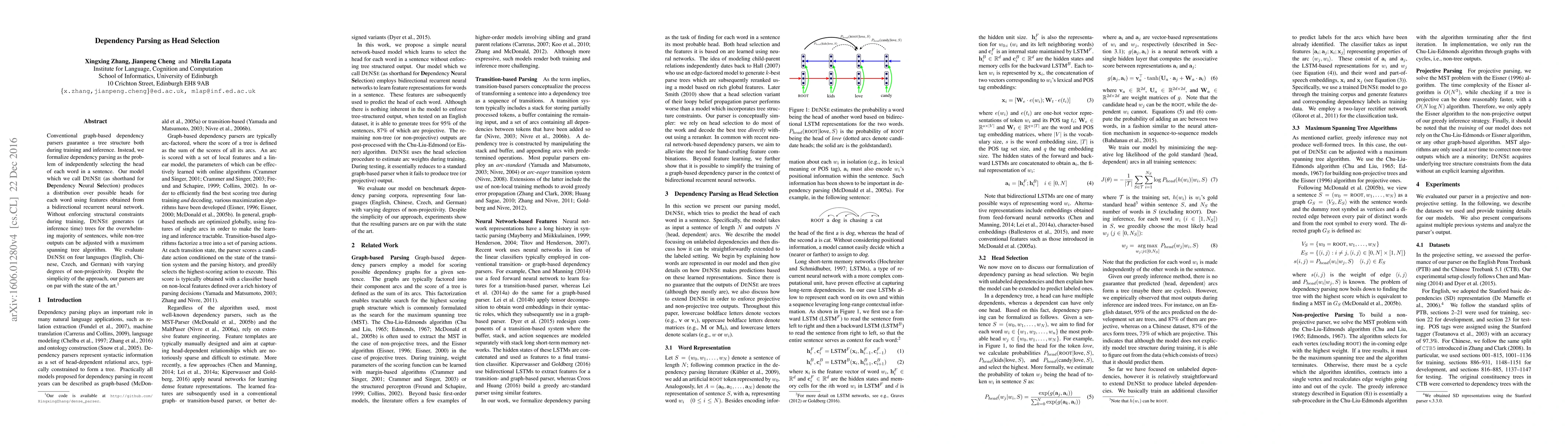 Conventional graph-based dependency parsers guarantee a tree structure both during training and inference. Instead, we formalize dependency parsing as the problem of independently selecting the head of each word in a sentence. Our model which we call \textsc{DeNSe} (as shorthand for {\bf De}pendency {\bf N}eural {\bf Se}lection) produces a distribution over possible heads for each word using features obtained from a bidirectional recurrent neural network. Without enforcing structural constraints during training, \textsc{DeNSe} generates (at inference time) trees for the overwhelming majority of sentences, while non-tree outputs can be adjusted with a maximum spanning tree algorithm. We evaluate \textsc{DeNSe} on four languages (English, Chinese, Czech, and German) with varying degrees of non-projectivity. Despite the simplicity of the approach, our parsers are on par with the state of the art.