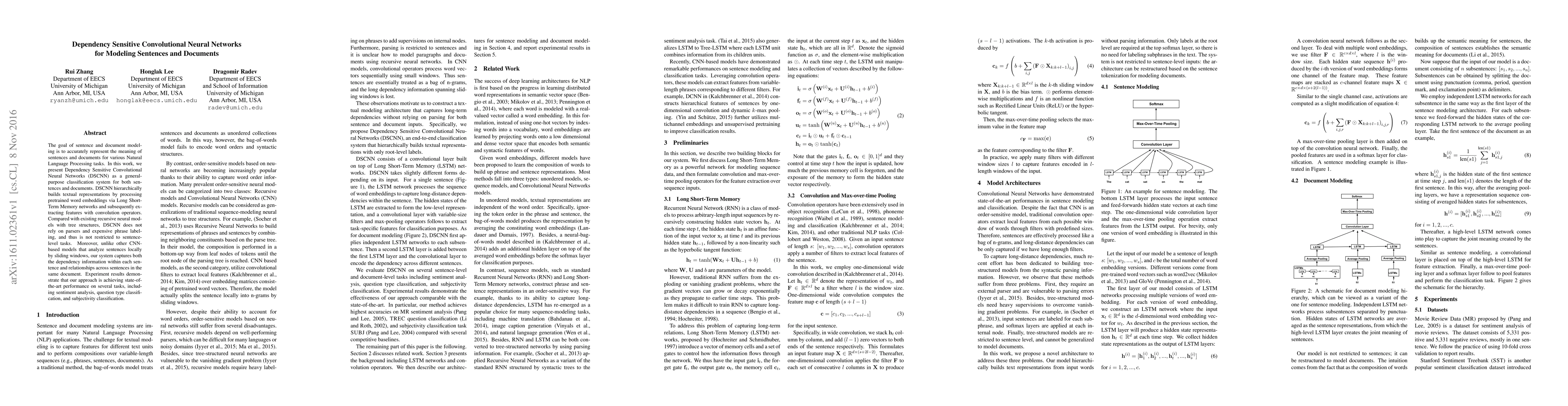 This research introduces Dependency Sensitive Convolutional Neural Networks (DSCNN) to represent sentences and documents by integrating dependency information and global document context, achieving state-of-the-art performance on various NLP tasks. Unlike traditional recursive models, DSCNN leverages pretrained embeddings and convolutional features without requiring parsers.