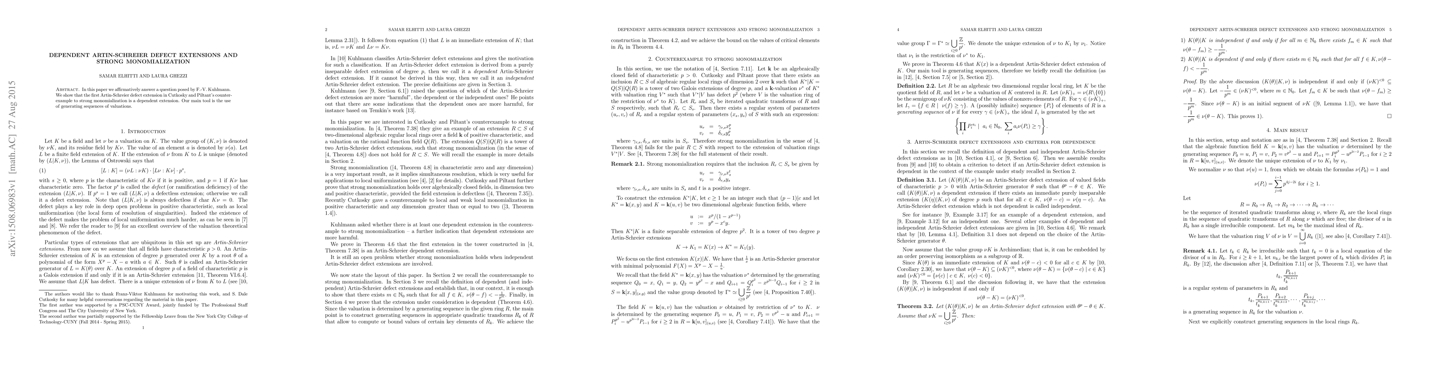 Summary: This paper confirms a question by F.-V. Kuhlmann, demonstrating that the first Artin-Schreier defect extension in a counter-example to strong monomialization is dependent, utilizing generating sequences of valuations as the primary tool.