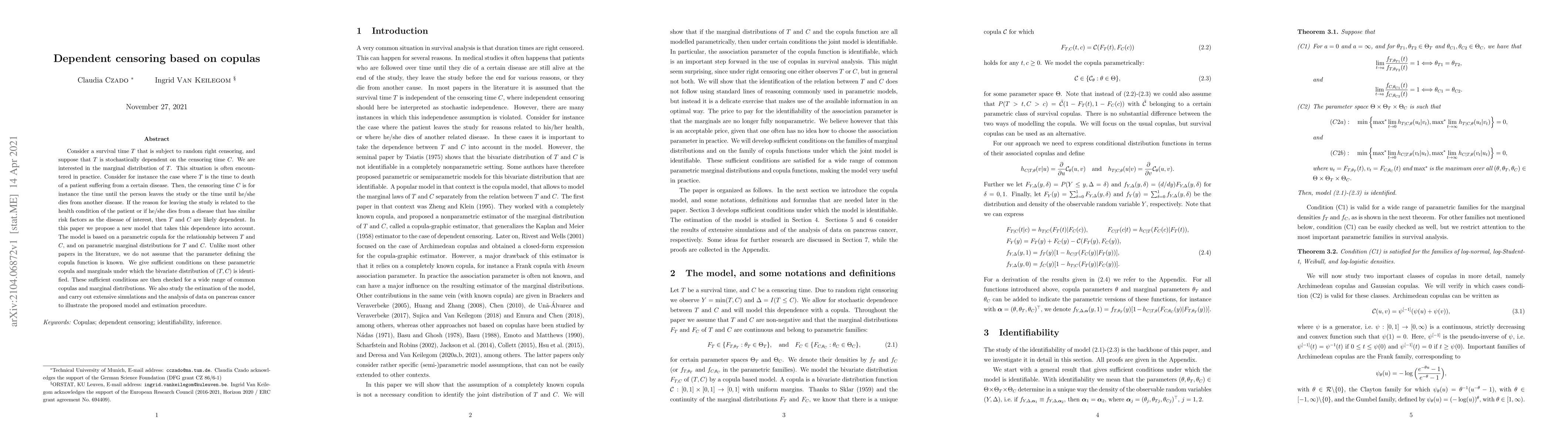 Consider a survival time T that is subject to random right censoring, and suppose that T is stochastically dependent on the censoring time C. We are interested in the marginal distribution of T. This situation is often encountered in practice. Consider for instance the case where T is the time to death of a patient suffering from a certain disease. Then, the censoring time C is for instance the time until the person leaves the study or the time until he/she dies from another disease. If the reason for leaving the study is related to the health condition of the patient or if he/she dies from a disease that has similar risk factors as the disease of interest, then T and C are likely dependent. In this paper we propose a new model that takes this dependence into account. The model is based on a parametric copula for the relationship between T and C, and on parametric marginal distributions for T and C. Unlike most other papers in the literature, we do not assume that the parameter defining the copula function is known. We give sufficient conditions on these parametric copula and marginals under which the bivariate distribution of (T;C) is identifed. These sufficient conditions are then checked for a wide range of common copulas and marginal distributions. We also study the estimation of the model, and carry out extensive simulations and the analysis of data on pancreas cancer to illustrate the proposed model and estimation procedure.