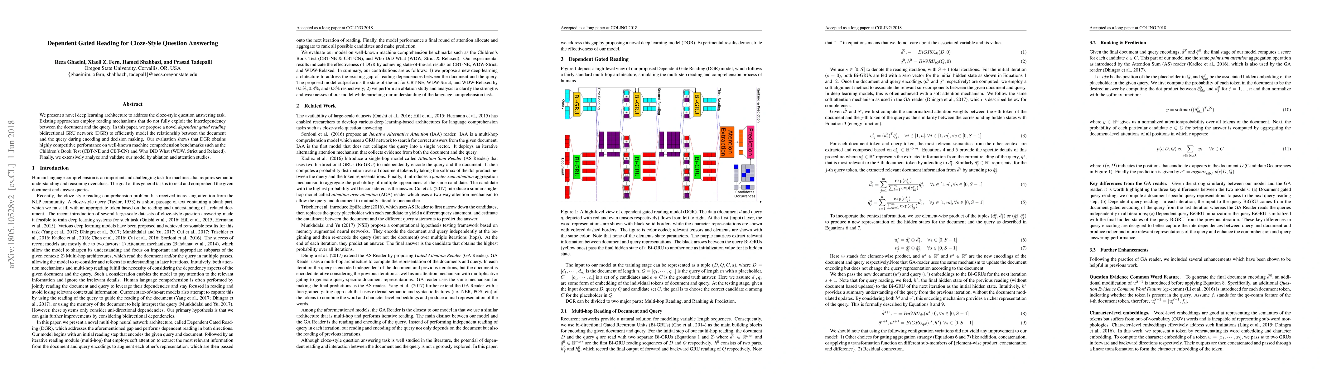 This paper introduces a novel deep learning architecture called Dependent Gated Reading (DGR) to improve cloze-style question answering by better modeling the interdependency between documents and queries. The DGR bidirectional GRU network achieves competitive performance on benchmark tests and is validated through ablation and attention studies.