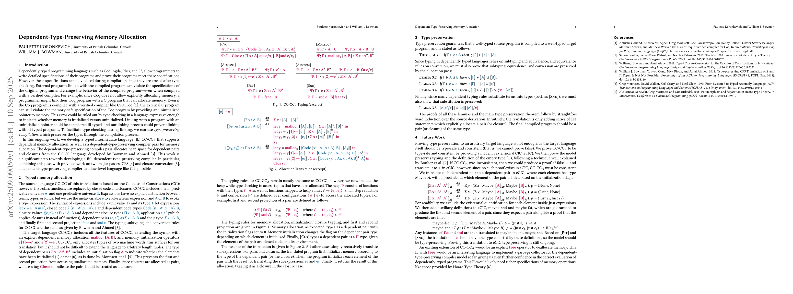 Dependently typed programming languages such as Coq, Agda, Idris, and F*, allow programmers to write detailed specifications of their programs and prove their programs meet these specifications. However, these specifications can be violated during compilation since they are erased after type checking. External programs linked with the compiled program can violate the specifications of the original program and change the behavior of the compiled program -- even when compiled with a verified compiler. For example, since Coq does not allow explicitly allocating memory, a programmer might link their Coq program with a C program that can allocate memory. Even if the Coq program is compiled with a verified compiler, the external C program can still violate the memory-safe specification of the Coq program by providing an uninitialized pointer to memory. This error could be ruled out by type checking in a language expressive enough to indicate whether memory is initialized versus uninitialized. Linking with a program with an uninitialized pointer could be considered ill-typed, and our linking process could prevent linking with ill-typed programs. To facilitate type checking during linking, we can use type-preserving compilation, which preserves the types through the compilation process. In this ongoing work, we develop a typed intermediate language that supports dependent memory allocation, as well as a dependent-type-preserving compiler pass for memory allocation.
