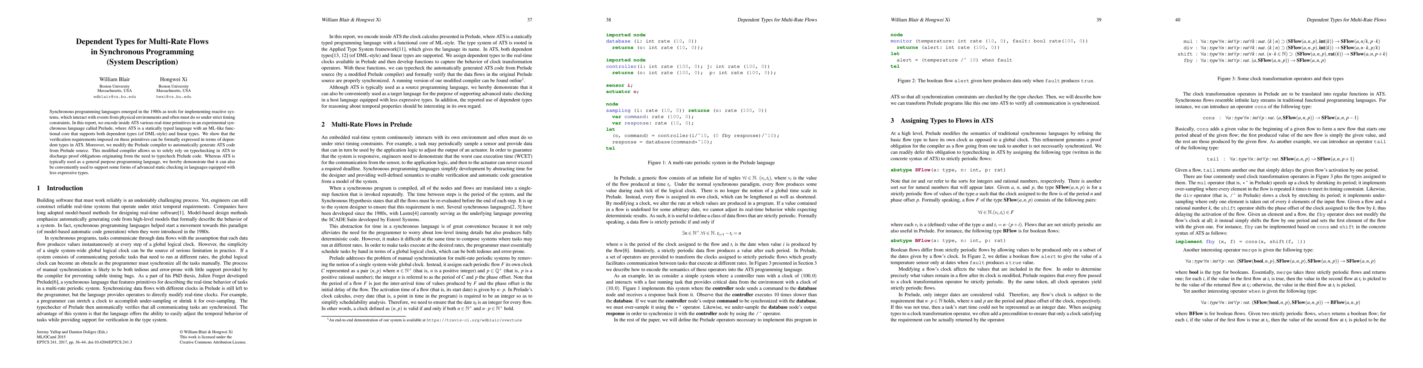 This paper explores encoding real-time primitives in a synchronous language called Prelude using ATS, a statically typed language with dependent types. It demonstrates how dependent types in ATS can formally express the verification requirements for these primitives and presents a modified compiler to generate ATS code from Prelude, relying on typechecking for proof obligations.