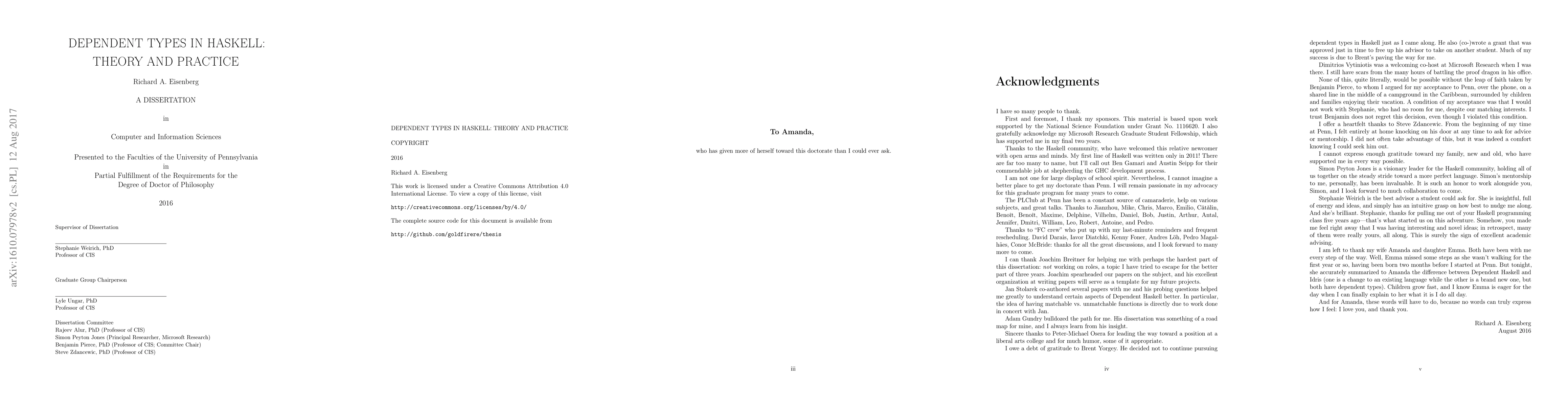 Haskell, as implemented in the Glasgow Haskell Compiler (GHC), has been adding new type-level programming features for some time. Many of these features---chiefly: generalized algebraic datatypes (GADTs), type families, kind polymorphism, and promoted datatypes---have brought Haskell to the doorstep of dependent types. Many dependently typed programs can even currently be encoded, but often the constructions are painful. In this dissertation, I describe Dependent Haskell, which supports full dependent types via a backward-compatible extension to today's Haskell. An important contribution of this work is an implementation, in GHC, of a portion of Dependent Haskell, with the rest to follow. The features I have implemented are already released, in GHC 8.0. This dissertation contains several practical examples of Dependent Haskell code, a full description of the differences between Dependent Haskell and today's Haskell, a novel type-safe dependently typed lambda-calculus (called Pico) suitable for use as an intermediate language for compiling Dependent Haskell, and a type inference and elaboration algorithm, Bake, that translates Dependent Haskell to type-correct Pico.