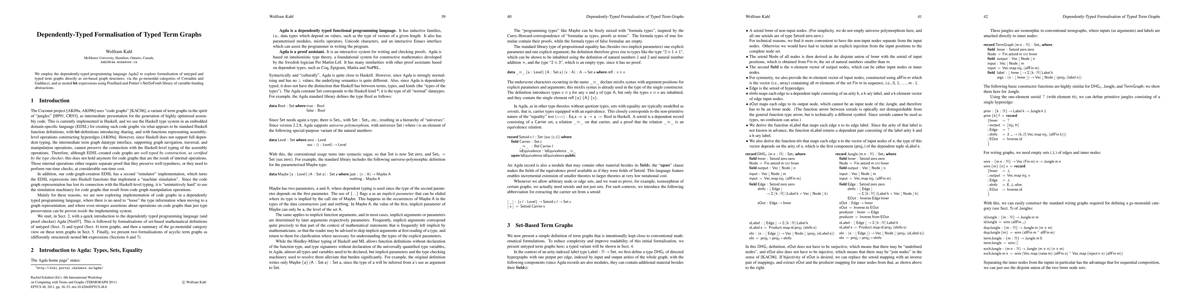 This paper uses Agda2, a dependently-typed language, to formalize untyped and typed term graphs as set-based graph structures based on gs-monoidal categories and as nested let-expressions via Pouillard and Pottier's NotSoFresh library. The work emphasizes formalization through dependent typing.